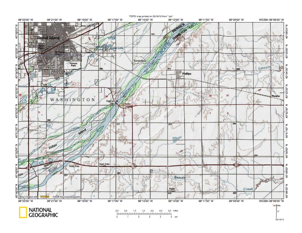 Figure 3: Platte River-Lincoln Creek drainage divide area in Hamilton County. United States Geological Survey map digitally presented using National Geographic Society TOPO software.