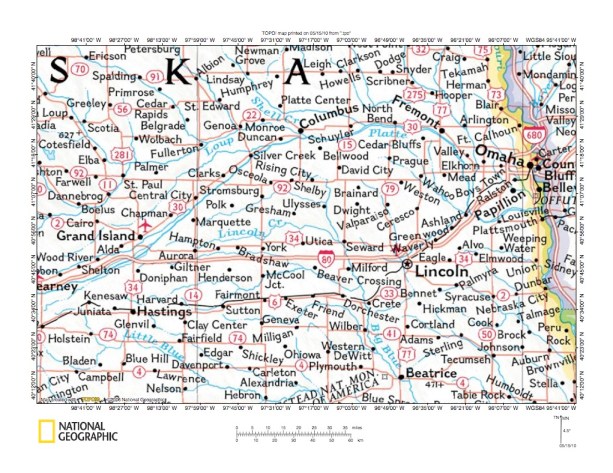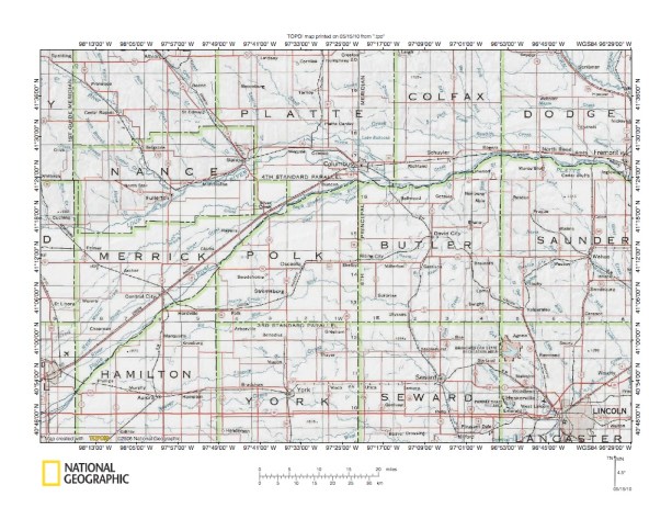 Figure 1: Platte River-Big Blue River drainage divide area location map (select and click on maps to enlarge). National Geographic Society map digitally presented using National Geographic Society TOPO software.