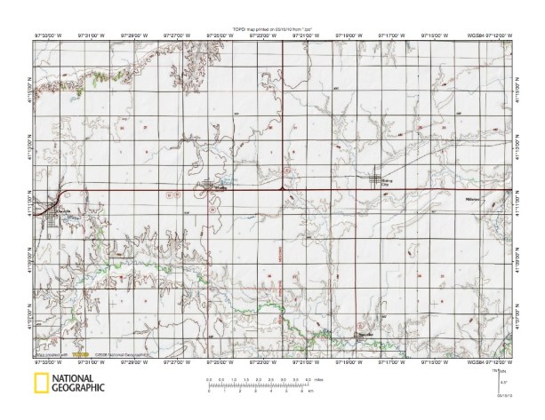 Figure 9: Big Blue River-Oak Creek drainage divide area east of Ulysses. United States Geological Survey map digitally presented using National Geographic Society TOPO software.