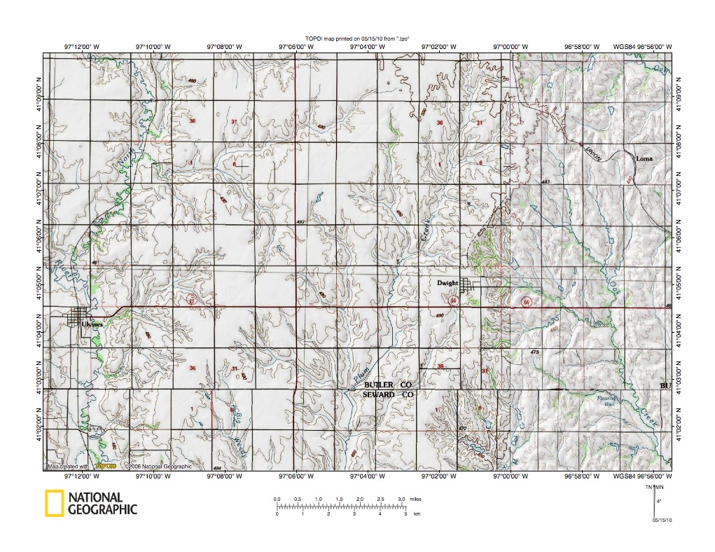 Figure 7: Big Blue River-Lincoln Creek drainage divide area west of Ulysses. United States Geological Survey map digitally presented using National Geographic Society TOPO software.