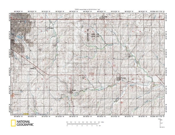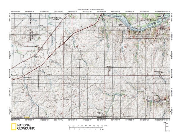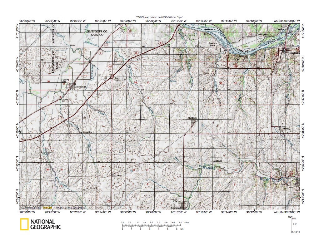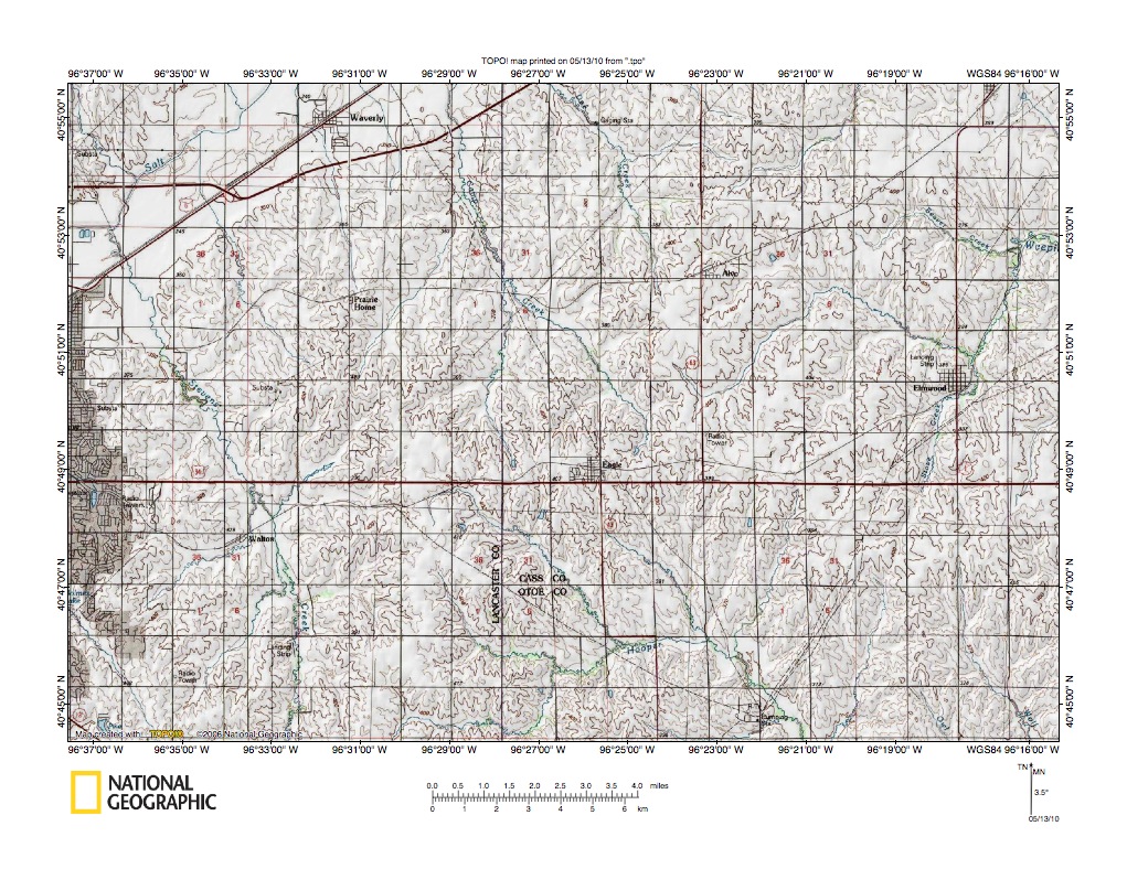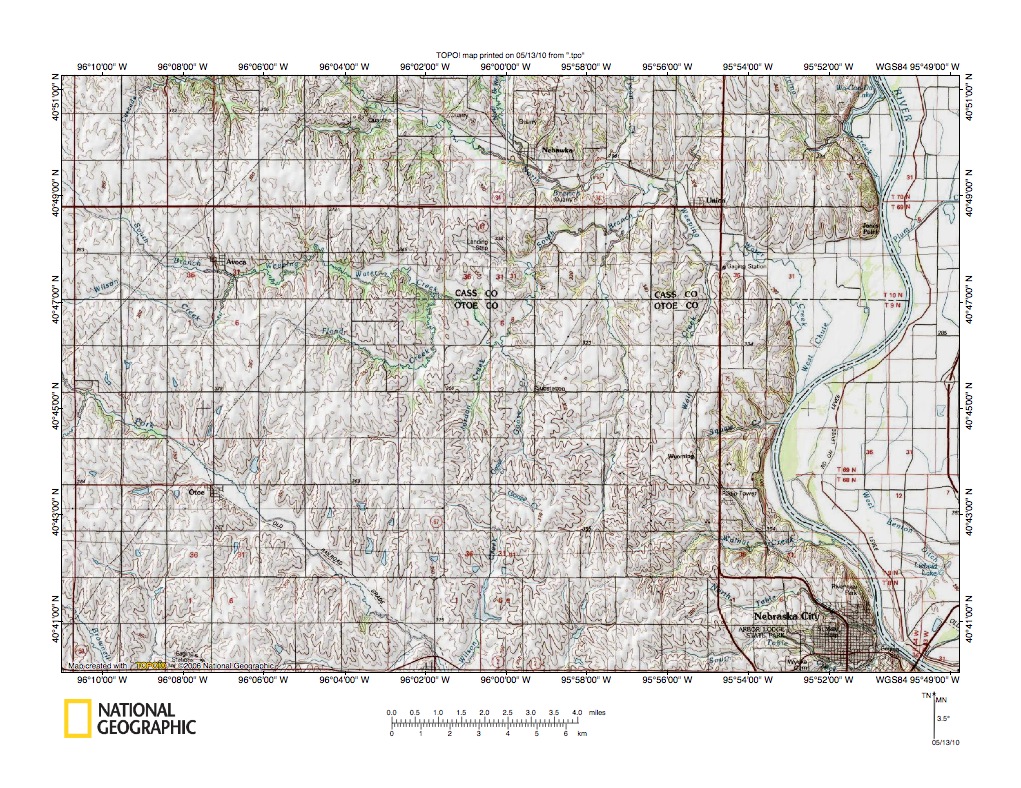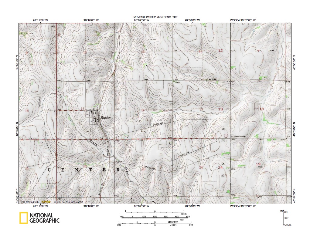 Figure 4: Detailed map of Platte River-Weeping Water Creek drainage divide area near Manley. United States Geological Survey map digitally presented using National Geographic Society TOPO software.