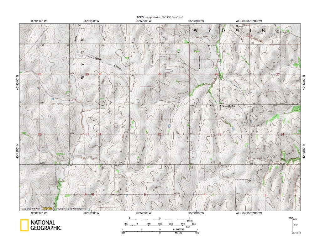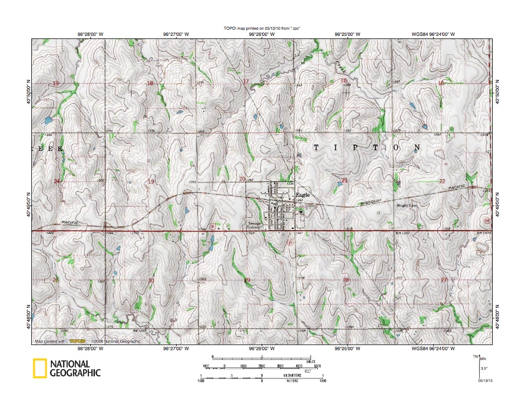 Figure 10: Weeping Water Creek-North Fork Little Nemaha River drainage divide area. United States Geological Survey map digitally presented using National Geographic Society TOPO software.