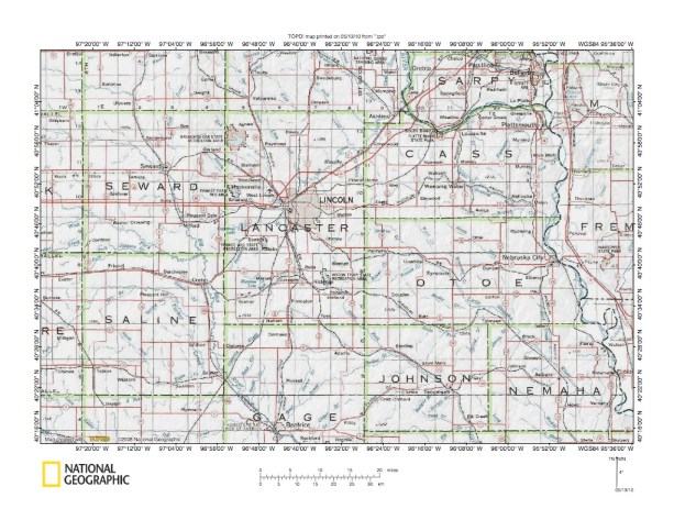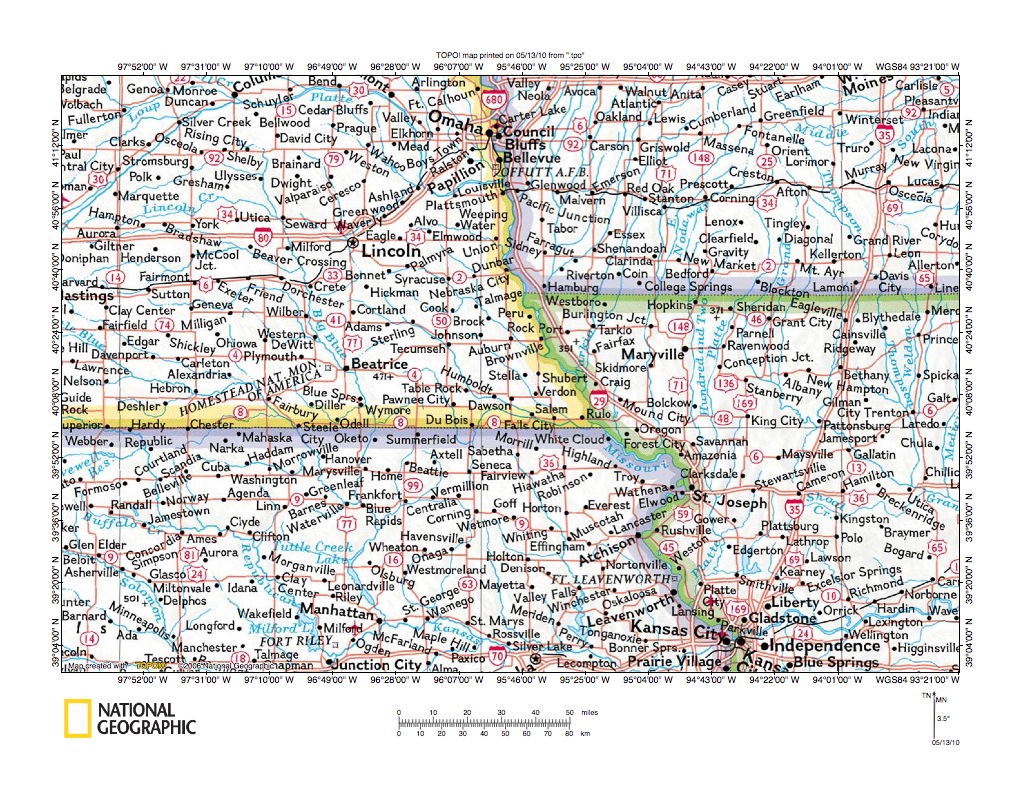 Figure 1: Platte River-Missouri River drainage divide area location map (select and click on maps to enlarge). National Geographic Society map digitally presented using National Geographic Society TOPO software.