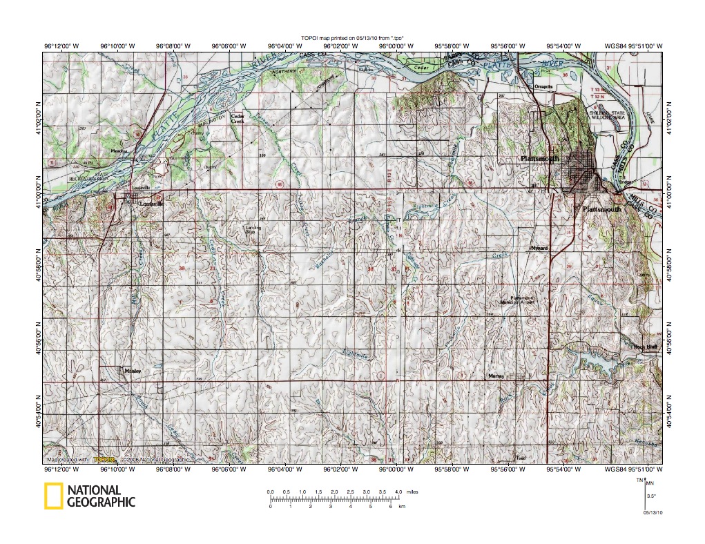 Figure 3: Platte River-Missouri River drainage divide area near Plattsmouth. United States Geological Survey map digitally presented using National Geographic Society TOPO software.