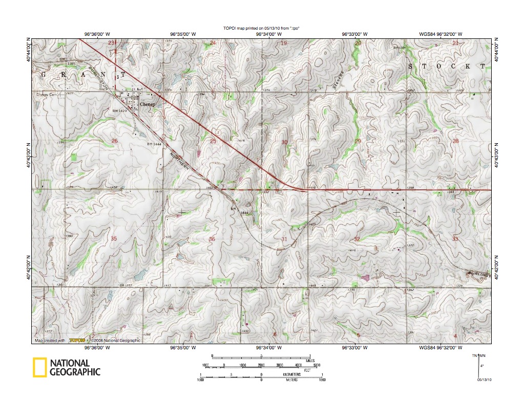 Figure 9: Detailed map of Stevens Creek-Little Nemaha River drainage divide area near Cheney. United States Geological Survey map digitally presented using National Geographic Society TOPO software.