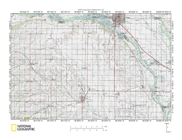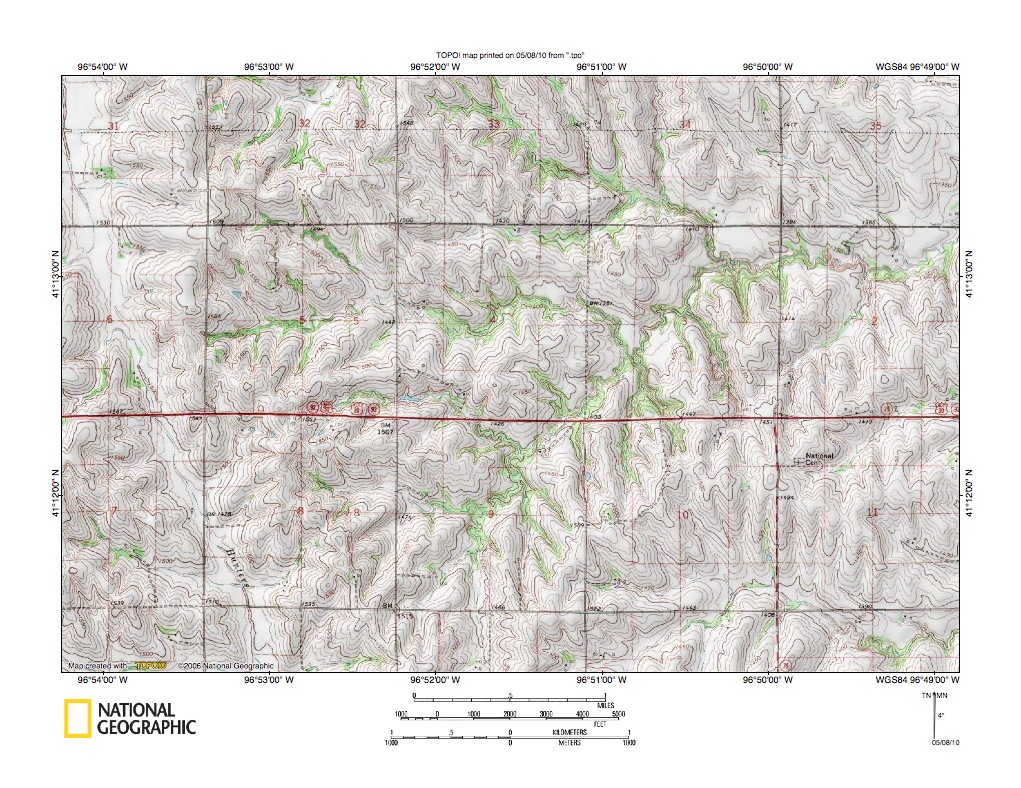 Figure 9a: Cottonwood Creek-North Fork Wahoo Creek drainage divide area near Malmo. United States Geological Survey map digitally presented using National Geographic Society TOPO software.