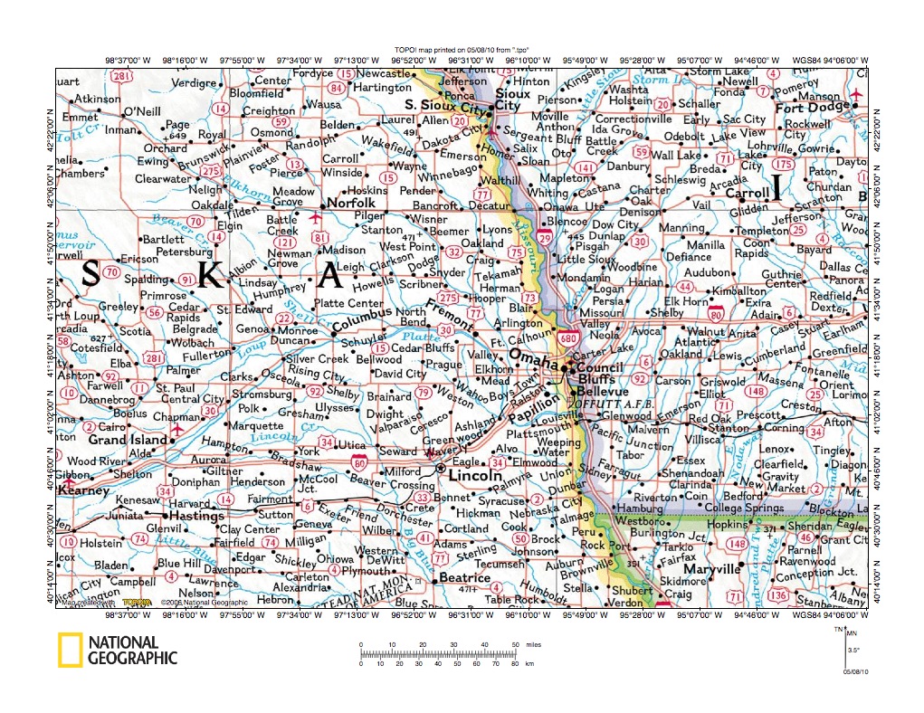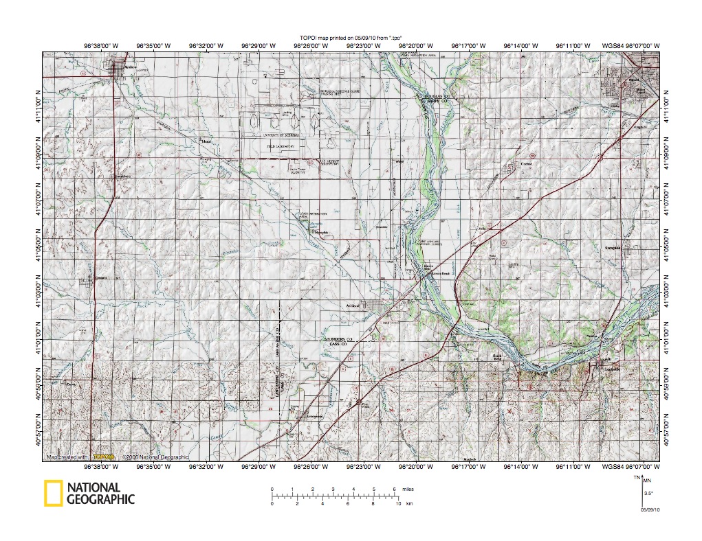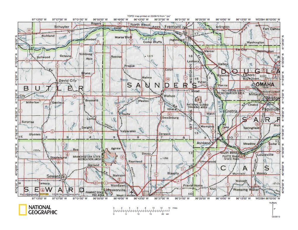 Figure 1: Platte River-Wahoo Creek drainage divide area location map (select and click on maps to enlarge). National Geographic Society map digitally presented using National Geographic Society TOPO software.