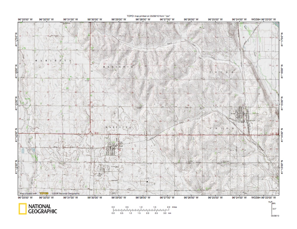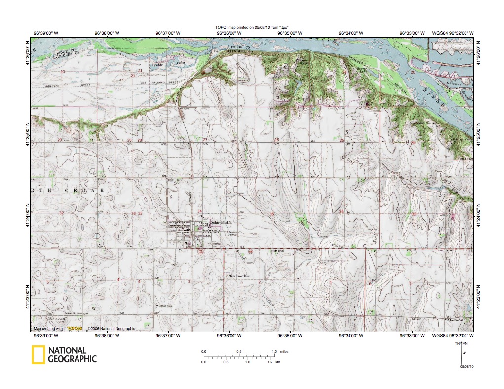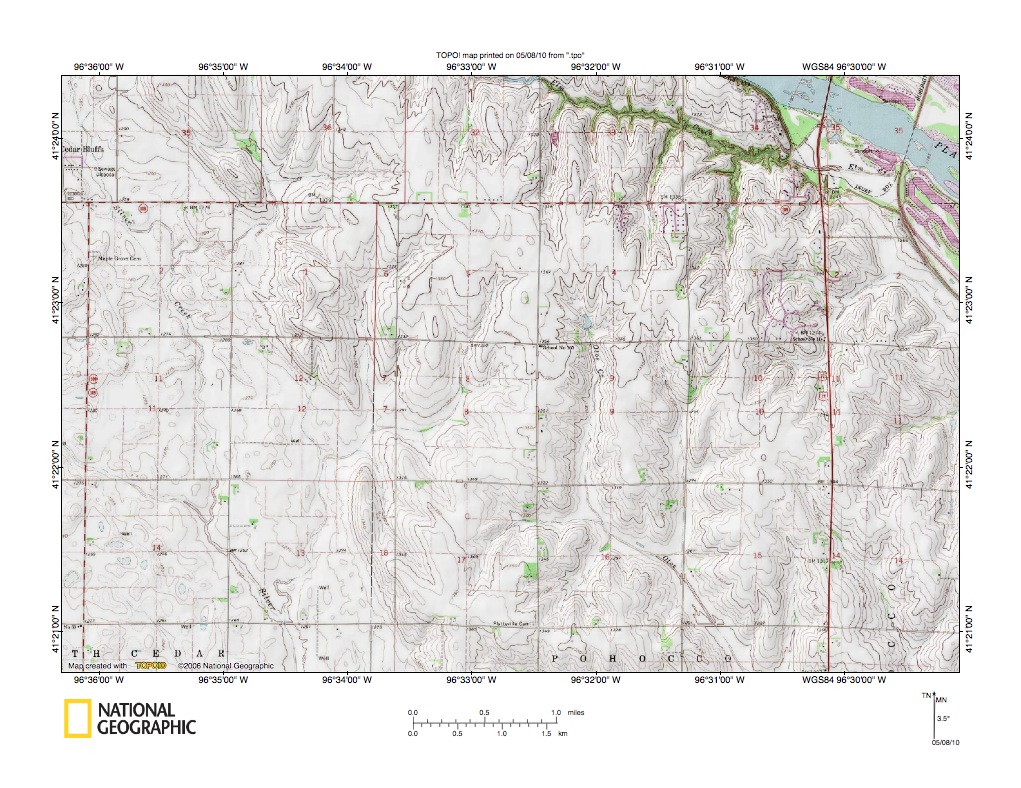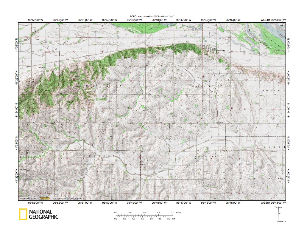 Figure 3a: South end of the Wahoo Creek valley, where Wahoo Creek joins the Platte River. United States Geological Survey map digitally presented using National Geographic Society TOPO software.