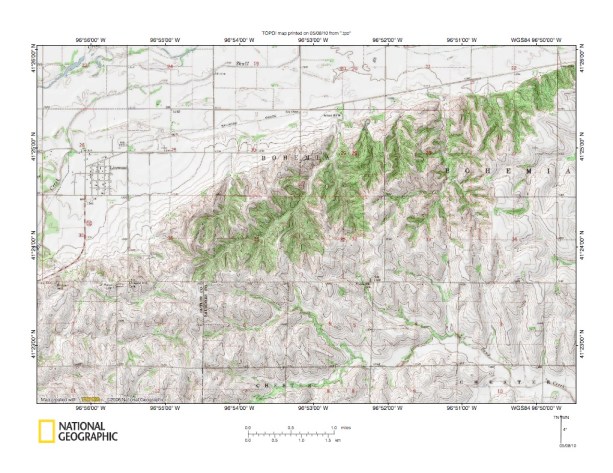Figure 5a: Platte River-Sand Creek drainage divide area between figure 5 map area and west wall of the large south-southeast oriented Wahoo Creek drained through valley. United States Geological Survey map digitally presented using National Geographic Society TOPO software.