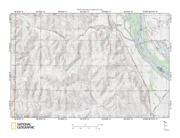 Figure 2: Platte River-Wahoo Creek drainage divide area detailed location map. United States Geological Survey map digitally presented using National Geographic Society TOPO software.