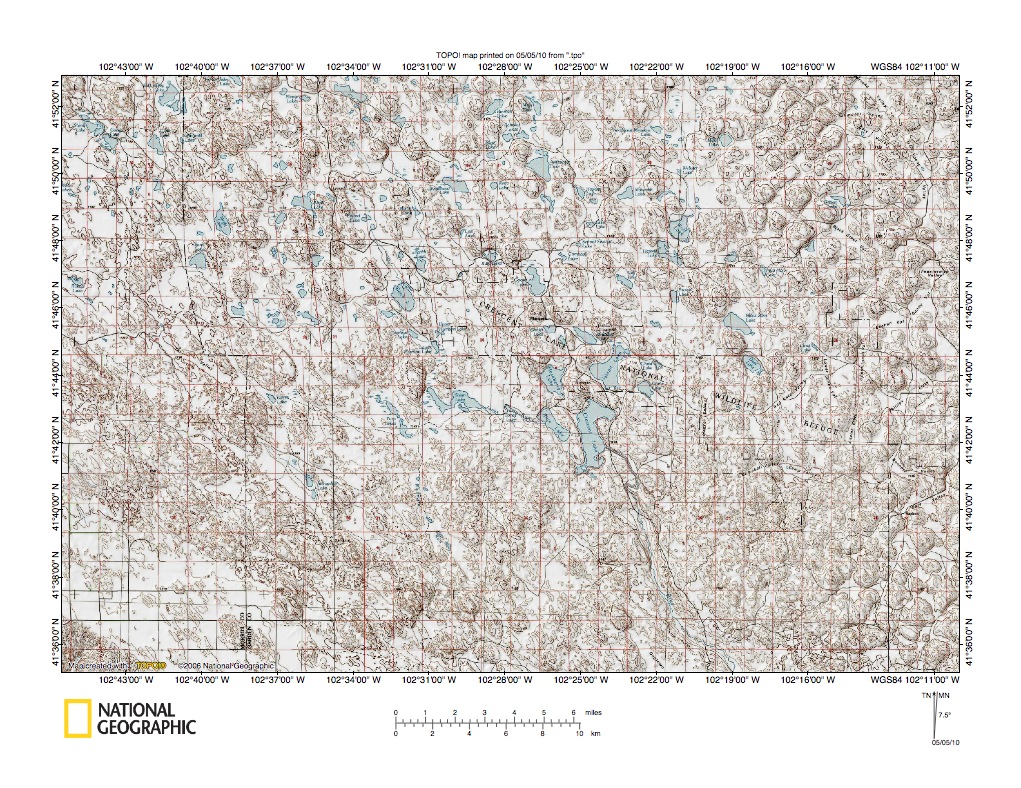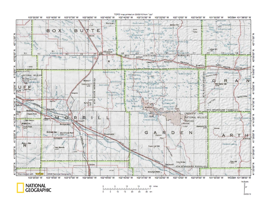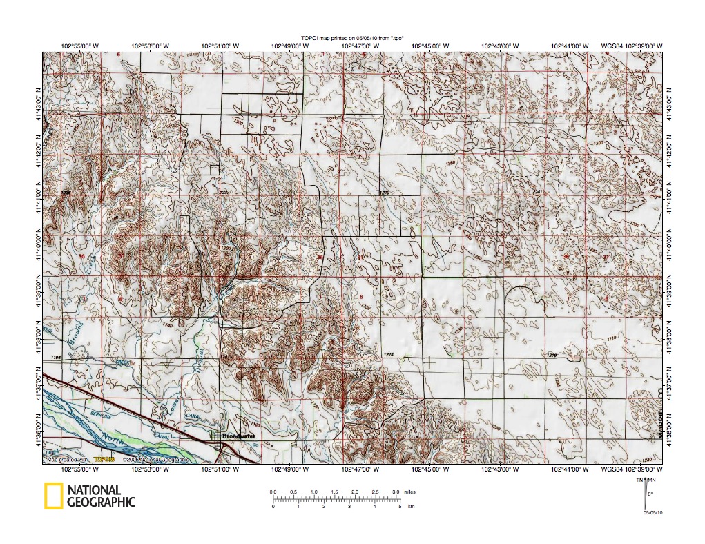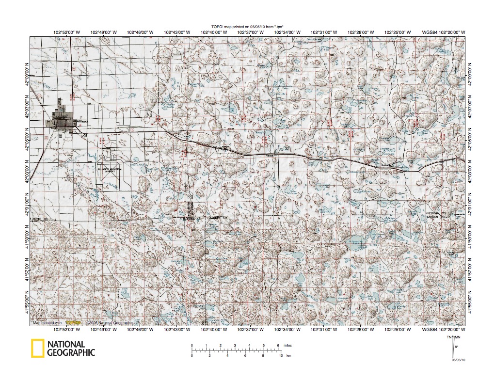 Figure 10: Snake Creek-North Platte River drainage divide area in region southeast of Alliance. United States Geological Survey map digitally presented using National Geographic Society TOPO software.