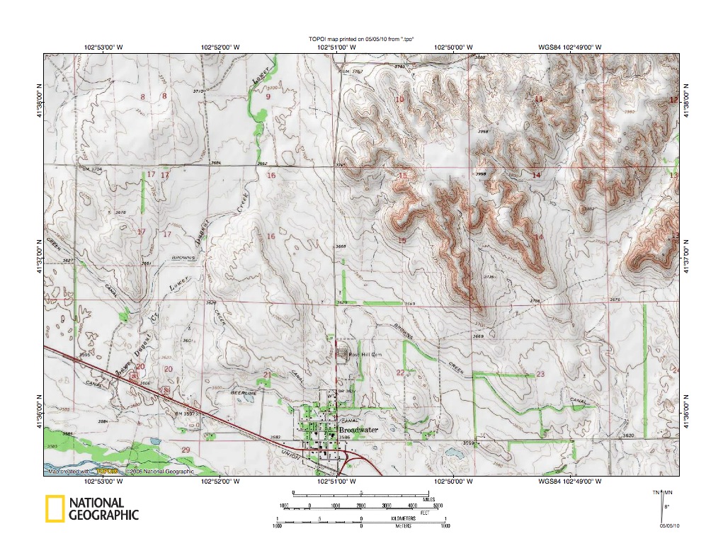 Figure 7: Detailed map of the Lower Dugout Creek-North Platte River drainage divide area. United States Geological Survey map digitally presented using National Geographic Society TOPO software.