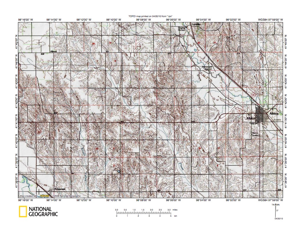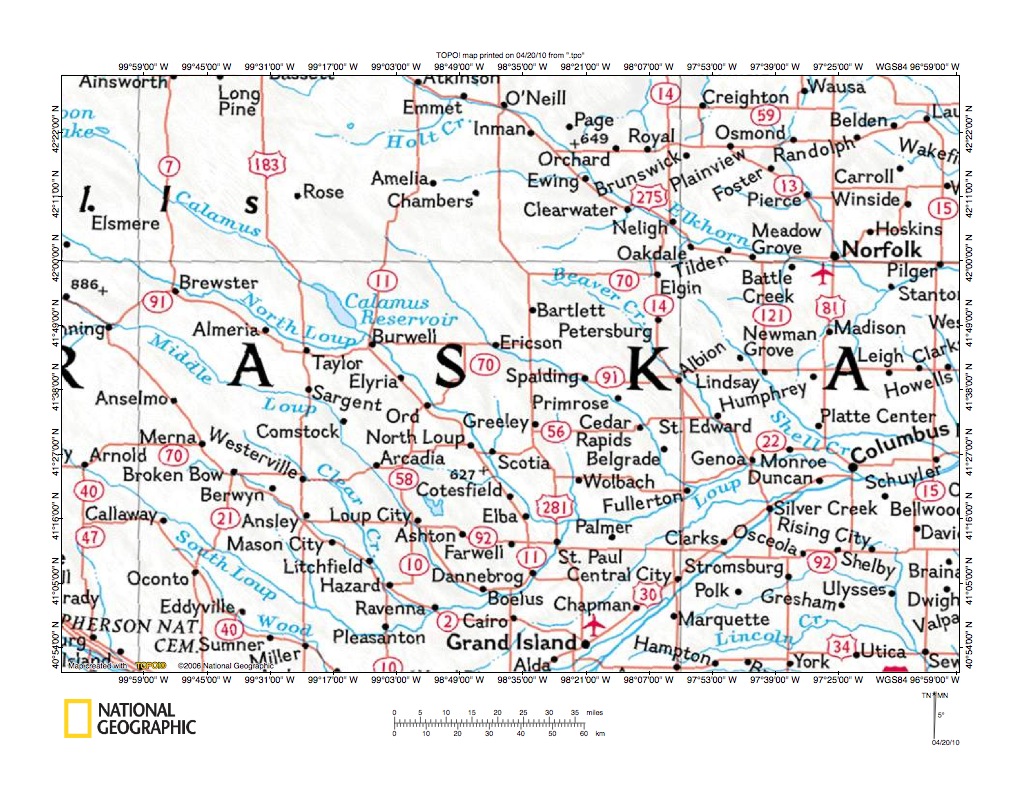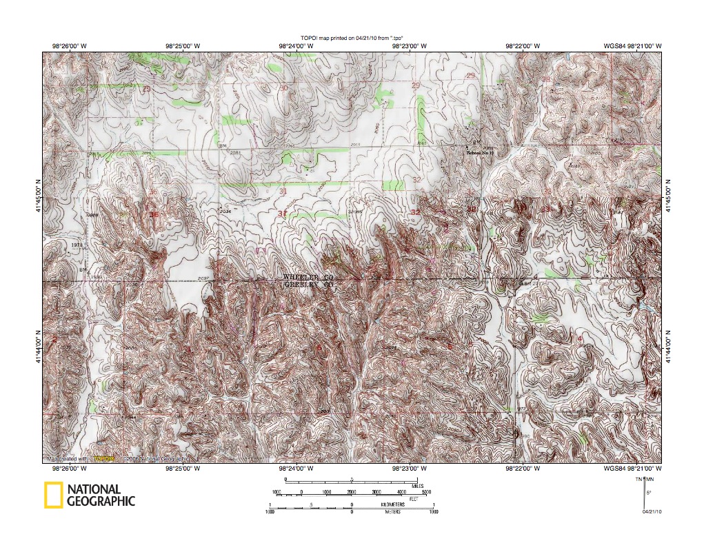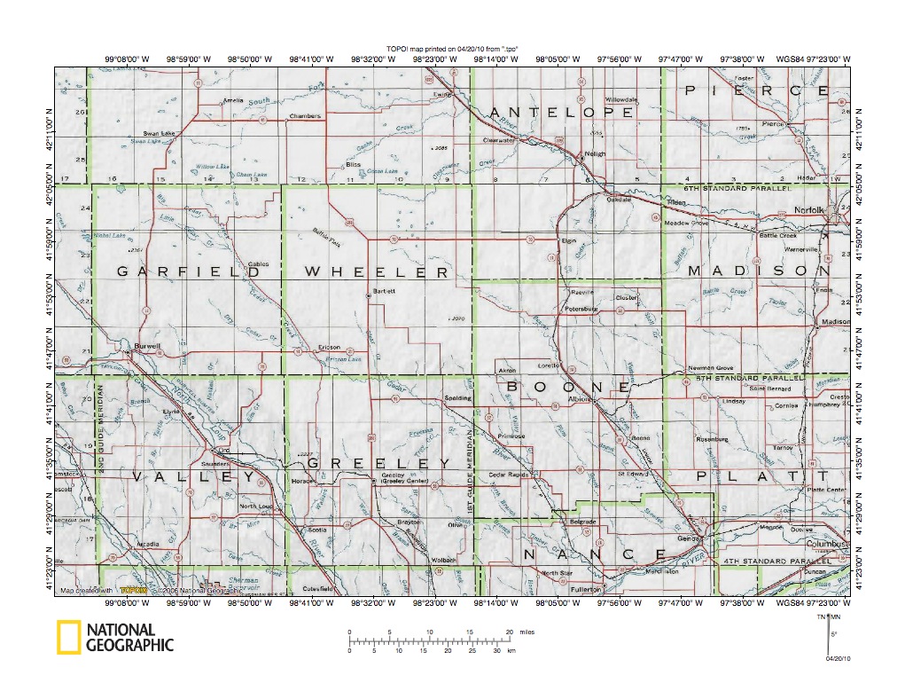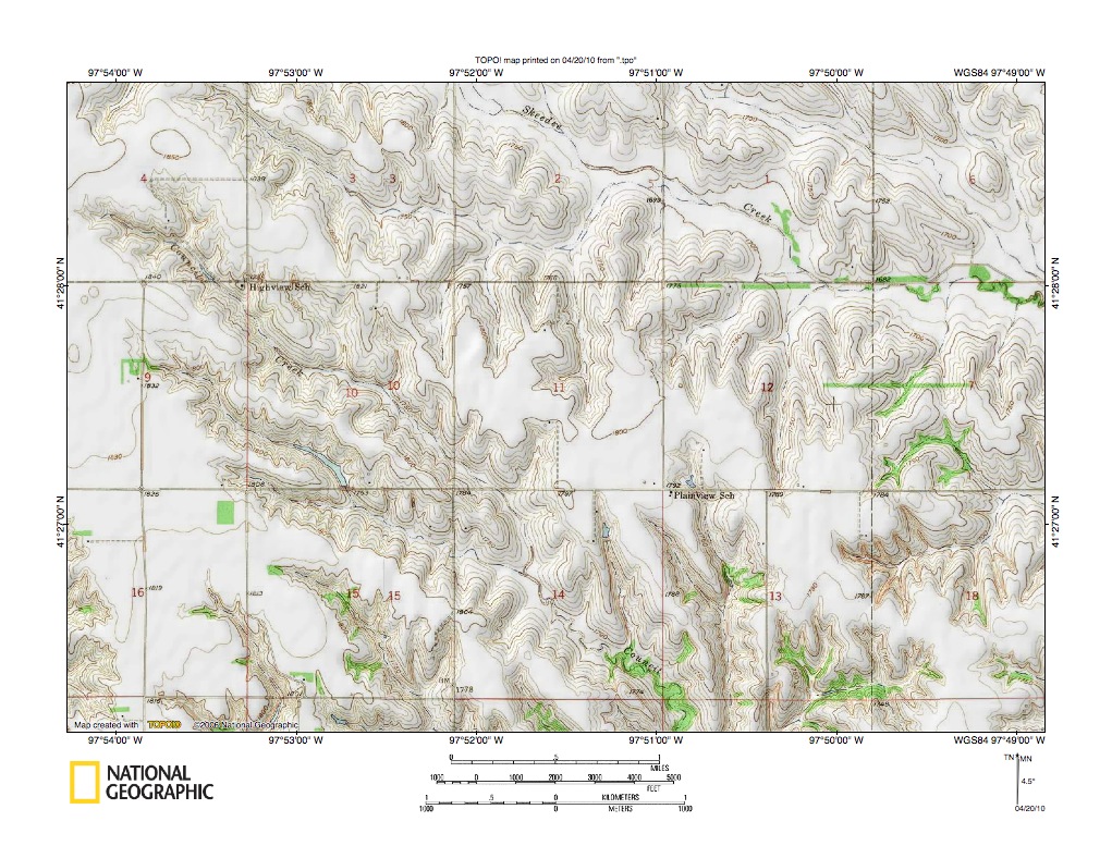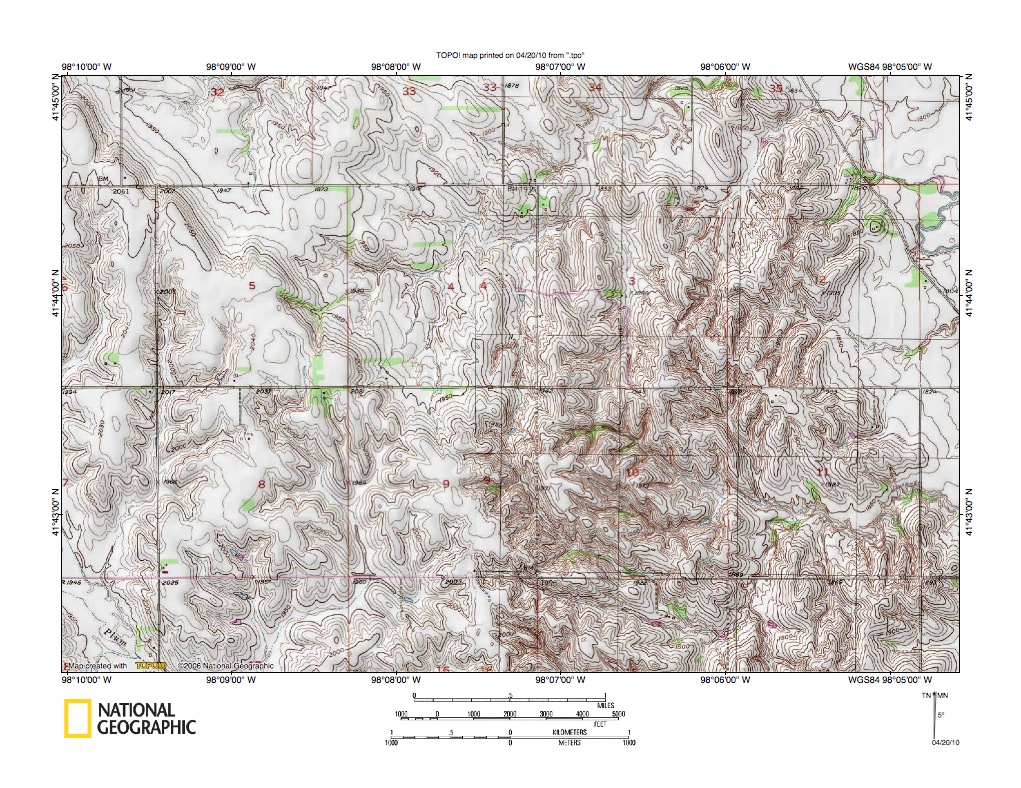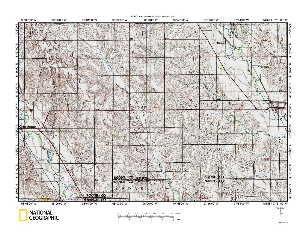 Figure 10: Beaver Creek-Cedar River drainage divide area northwest of Spalding.United States Geological Survey map digitally presented using National Geographic Society TOPO software.