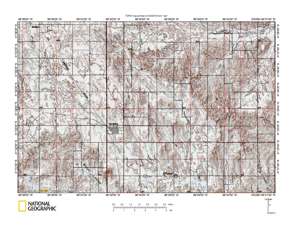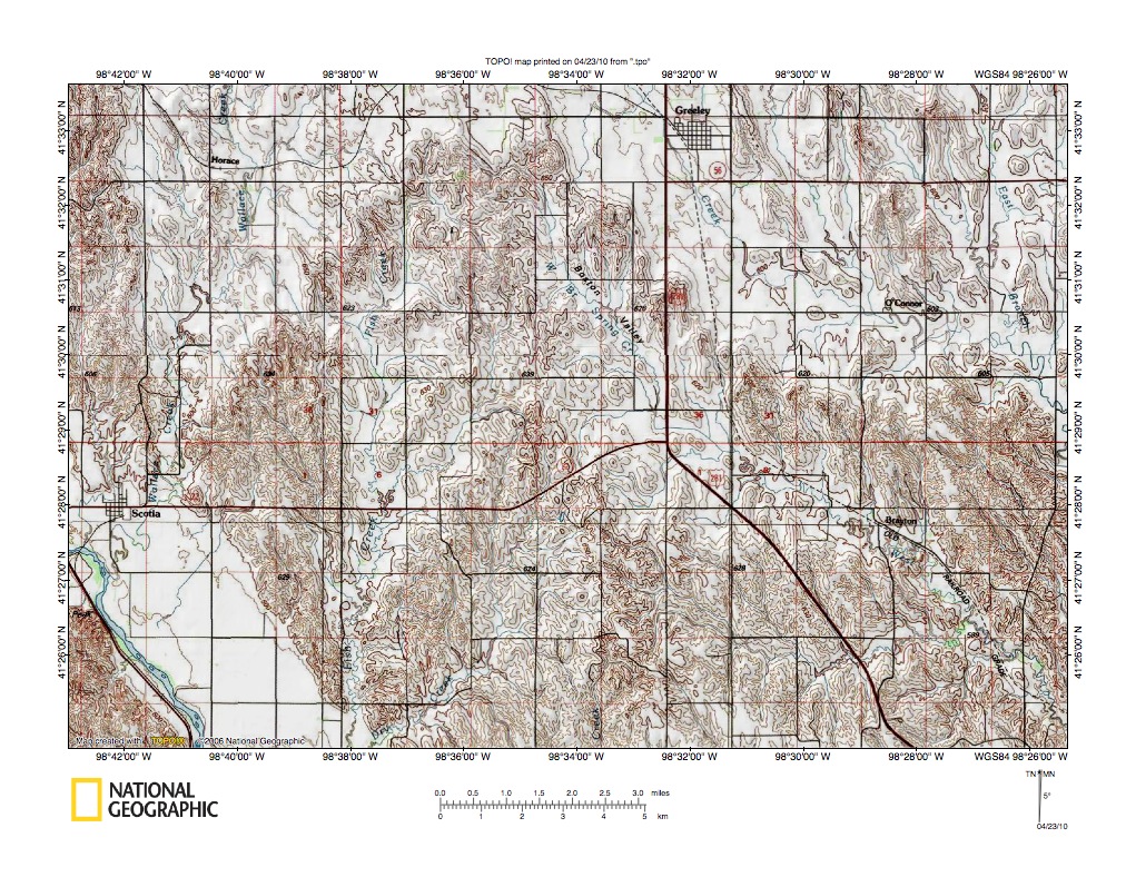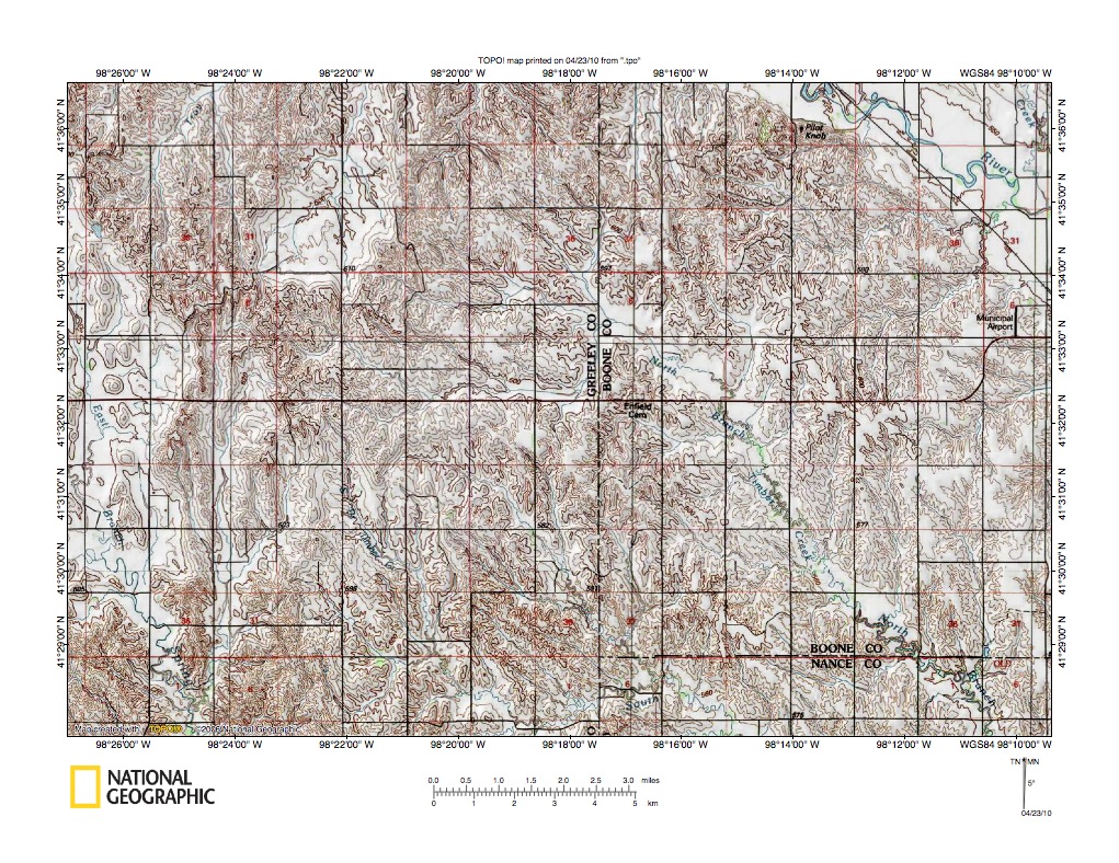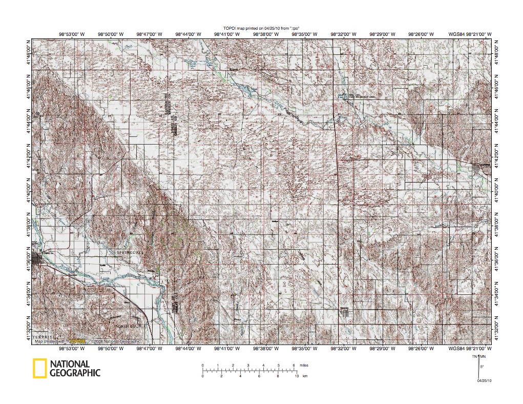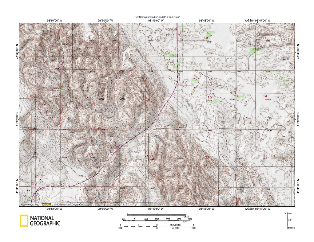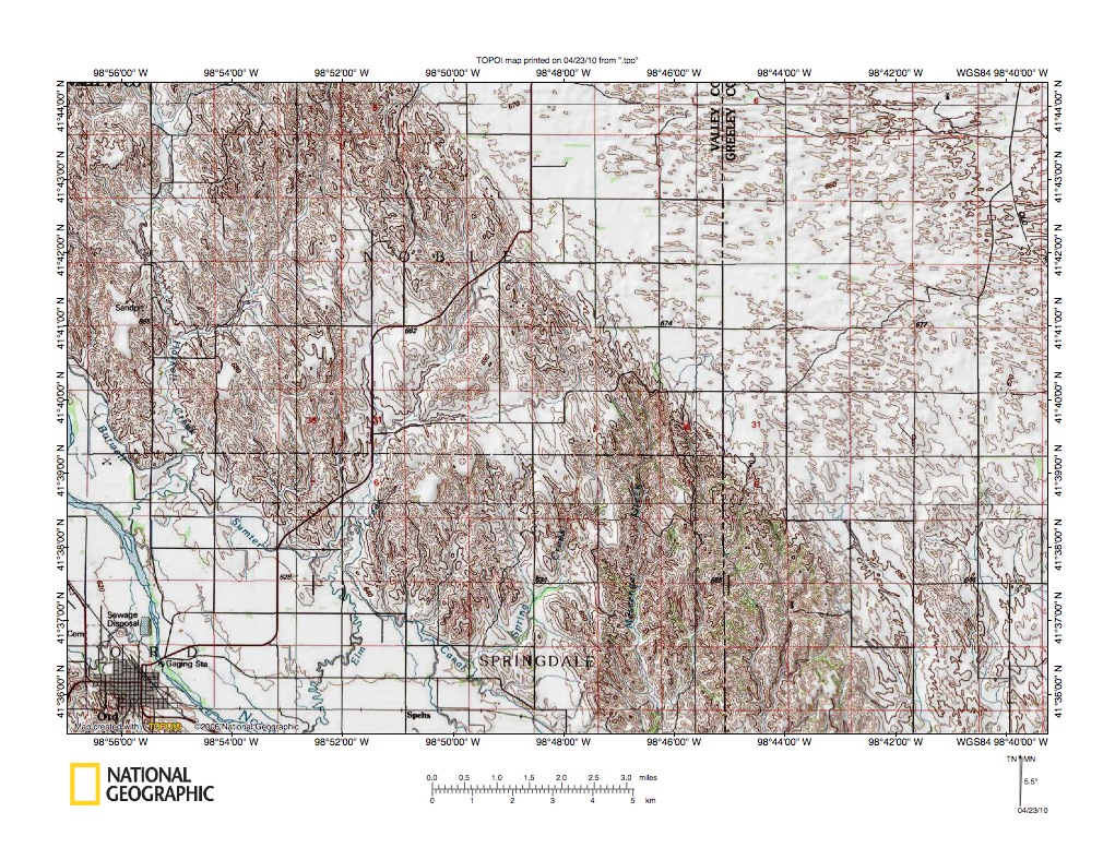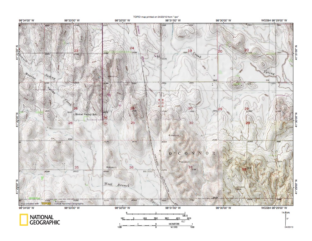 Figure 6: Spring Creek-North Loup River drainage divide area. United States Geological Survey map digitally presented using National Geographic Society TOPO software.