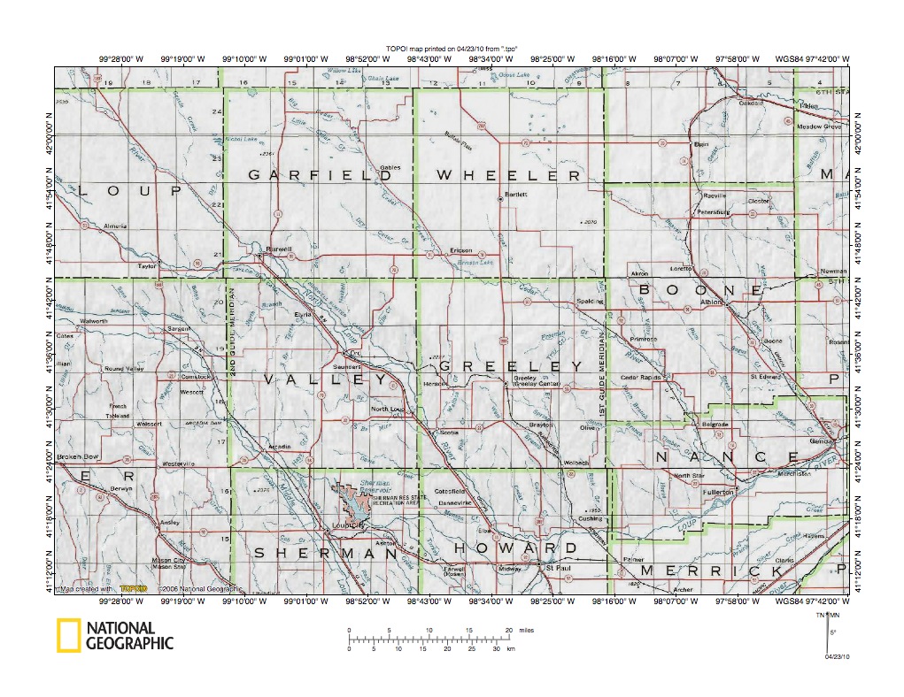 Figure 1: Cedar River-North Loup River drainage divide area location map (select and click on maps to enlarge). National Geographic Society map digitally presented using National Geographic Society TOPO software.