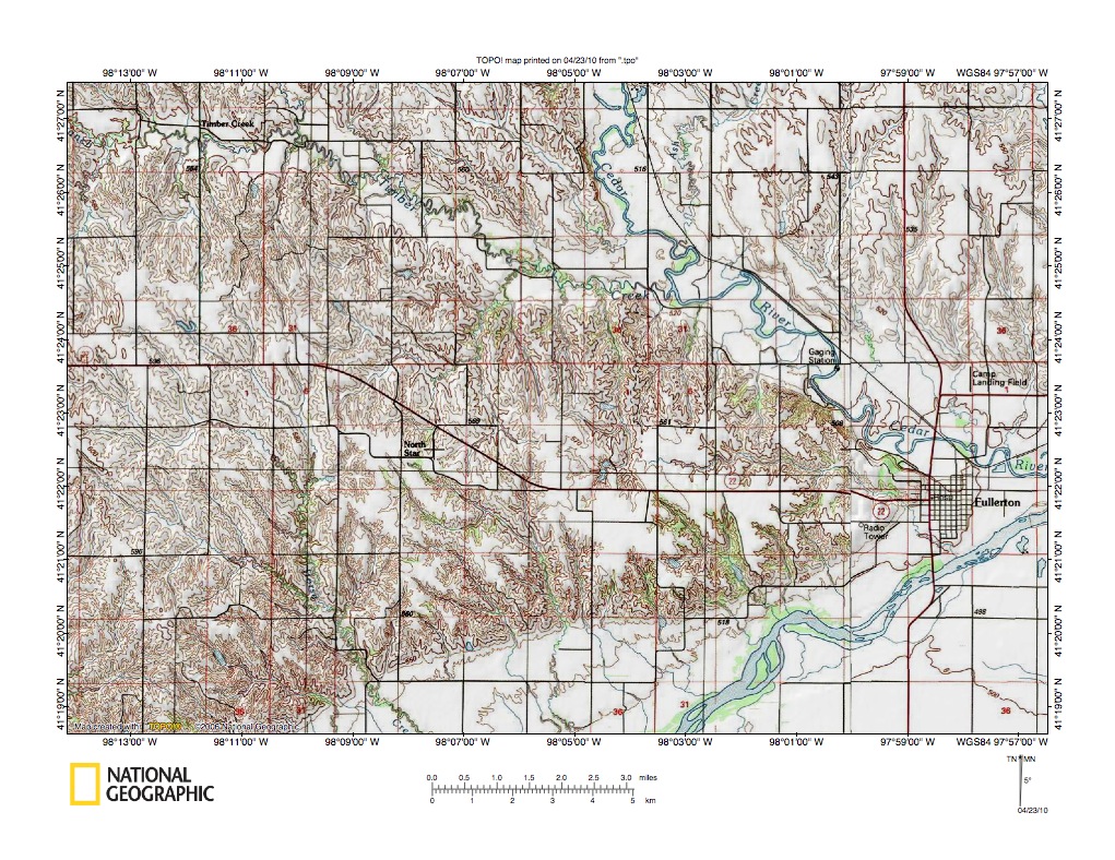 Figure 2: Cedar River-North Loup River drainage divide area detailed location map. United States Geological Survey map digitally presented using National Geographic Society TOPO software.