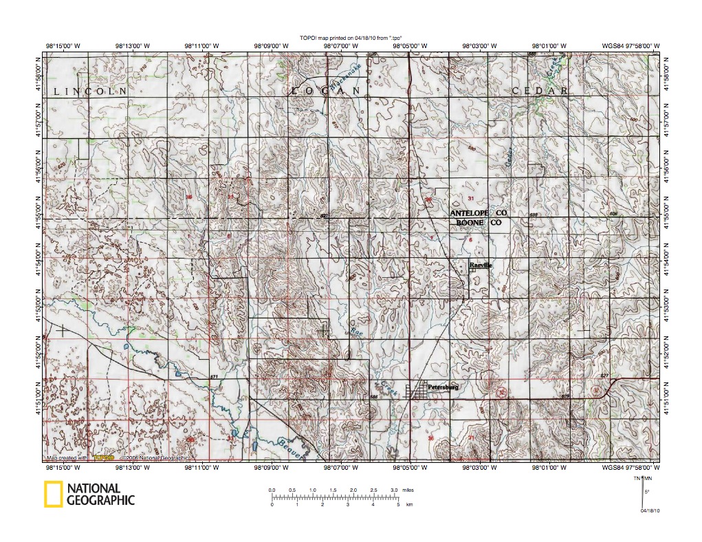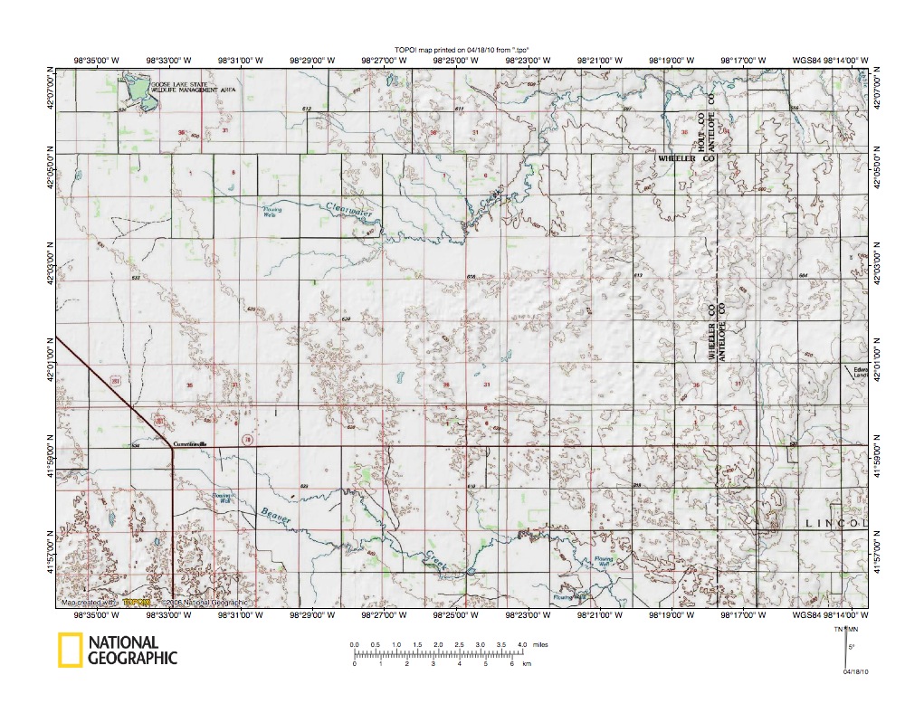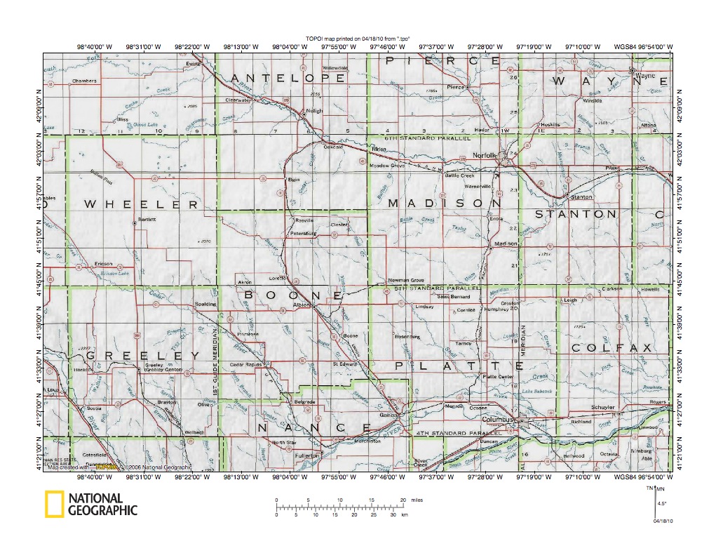 Figure 1: Elkhorn River-Loup River drainage divide area between Shell Creek and Beaver Creek location map (select and click on maps to enlarge). National Geographic Society map digitally presented using National Geographic Society TOPO software.