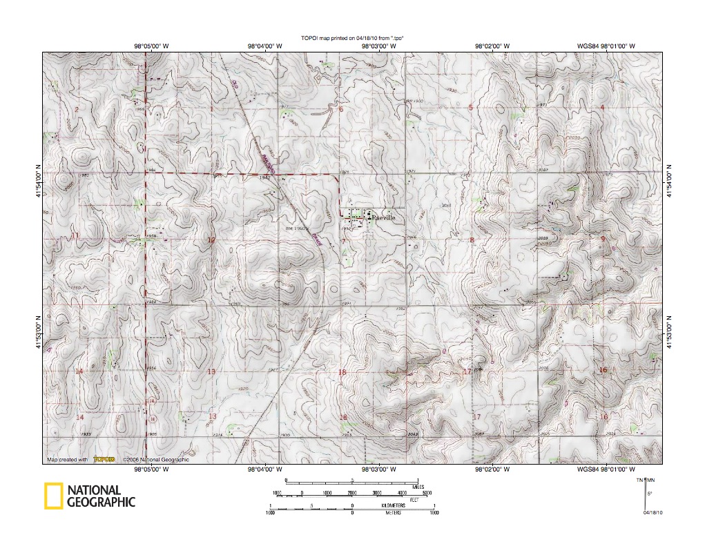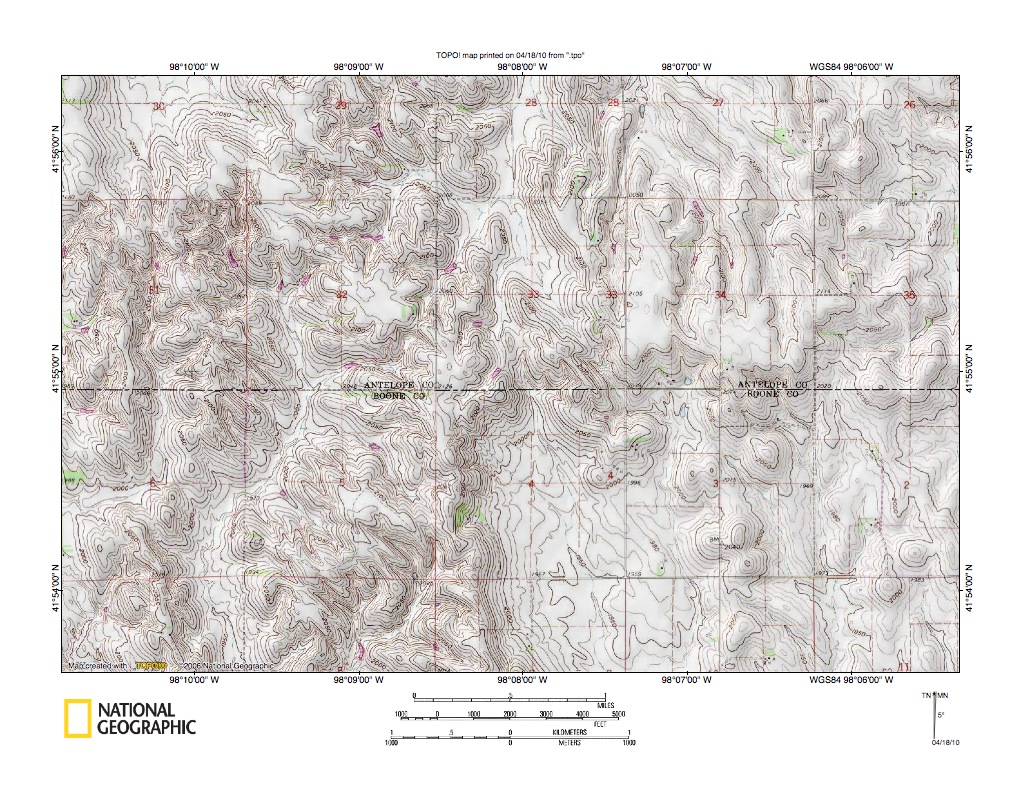 Figure 2: Elkhorn River-Loup River drainage divide area between Shell Creek and Beaver Creek detailed location map. United States Geological Survey map digitally presented using National Geographic Society TOPO software.