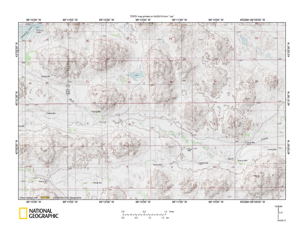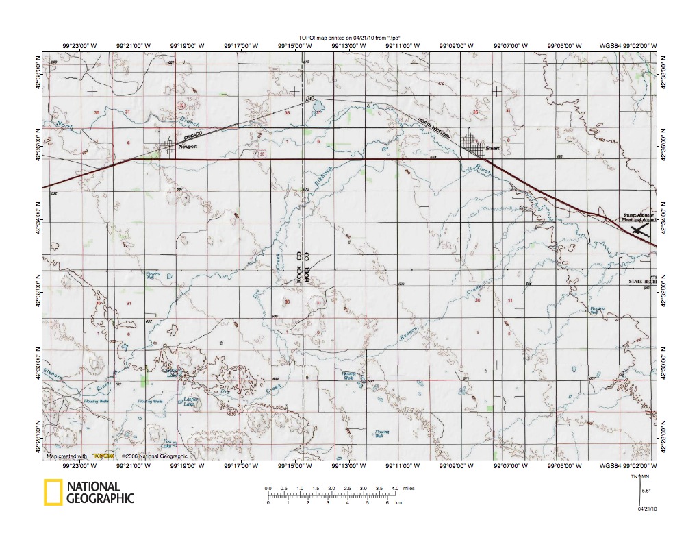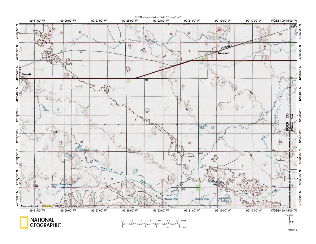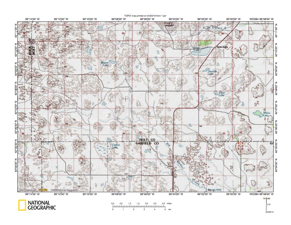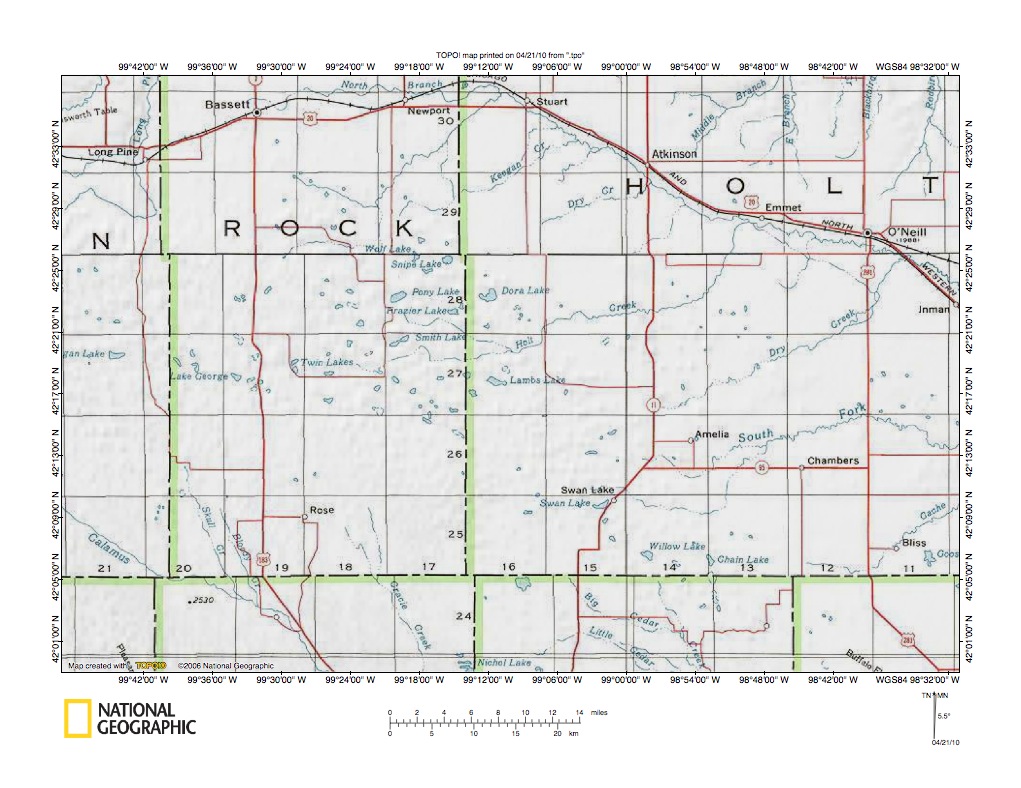Figure 8: Holt Creek headwaters along Rock County-Holt County border. United States Geological Survey map digitally presented using National Geographic Society TOPO software.