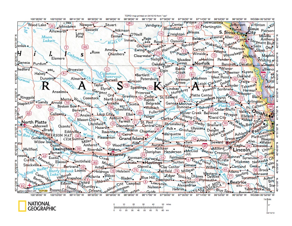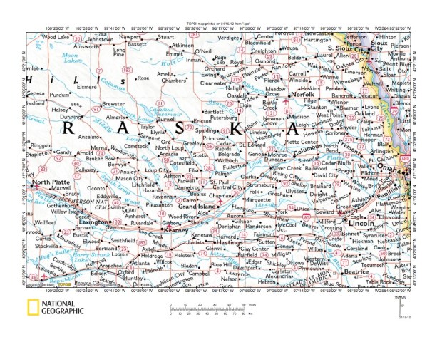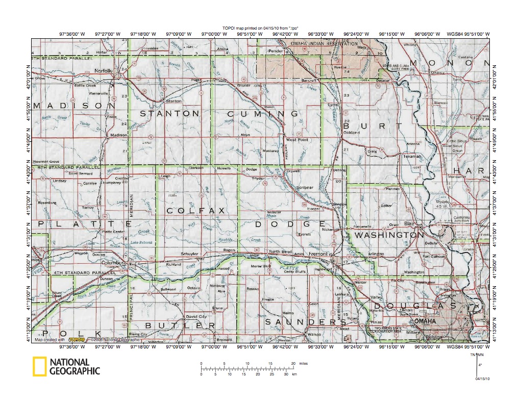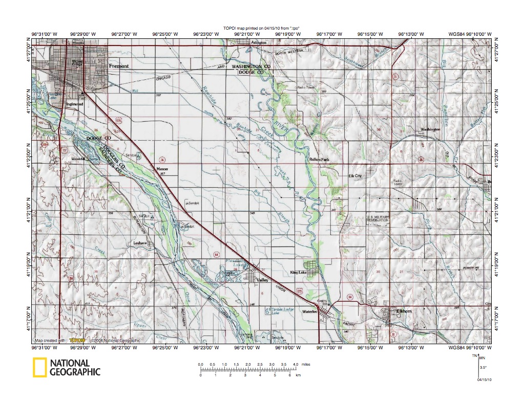 Figure 1: Elkhorn River-Platte River drainage divide area location map (select and click on maps to enlarge). National Geographic Society map digitally presented using National Geographic Society TOPO software.