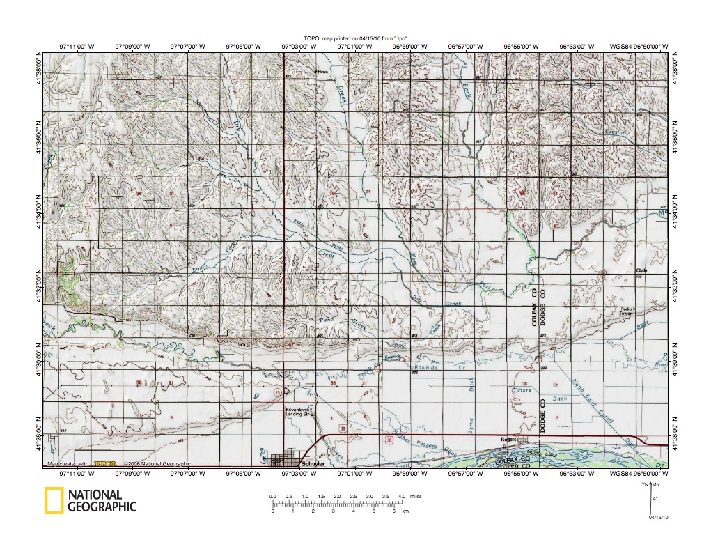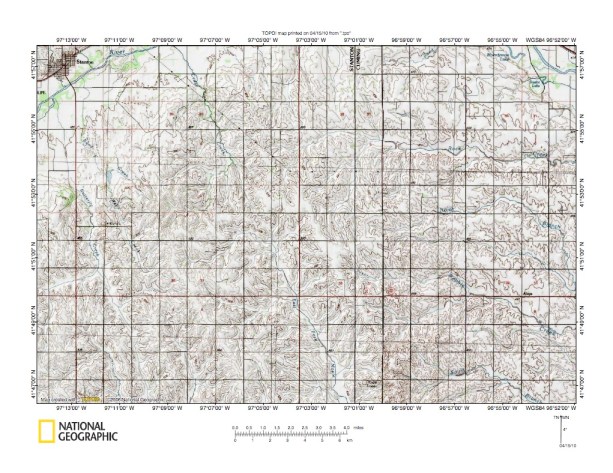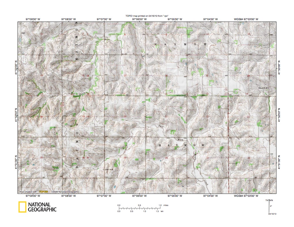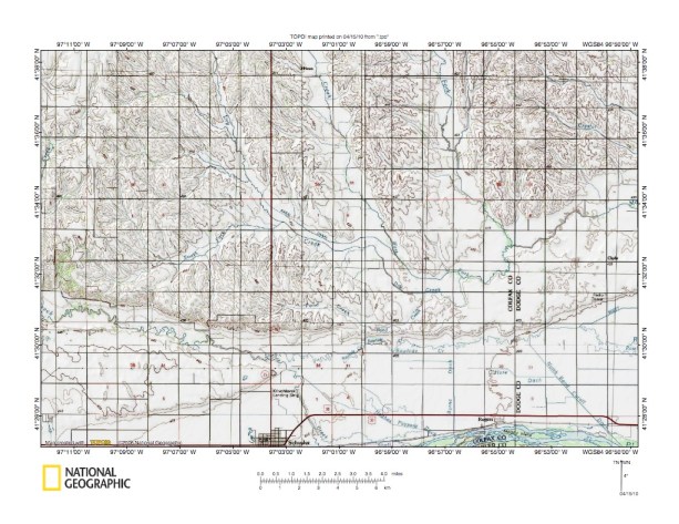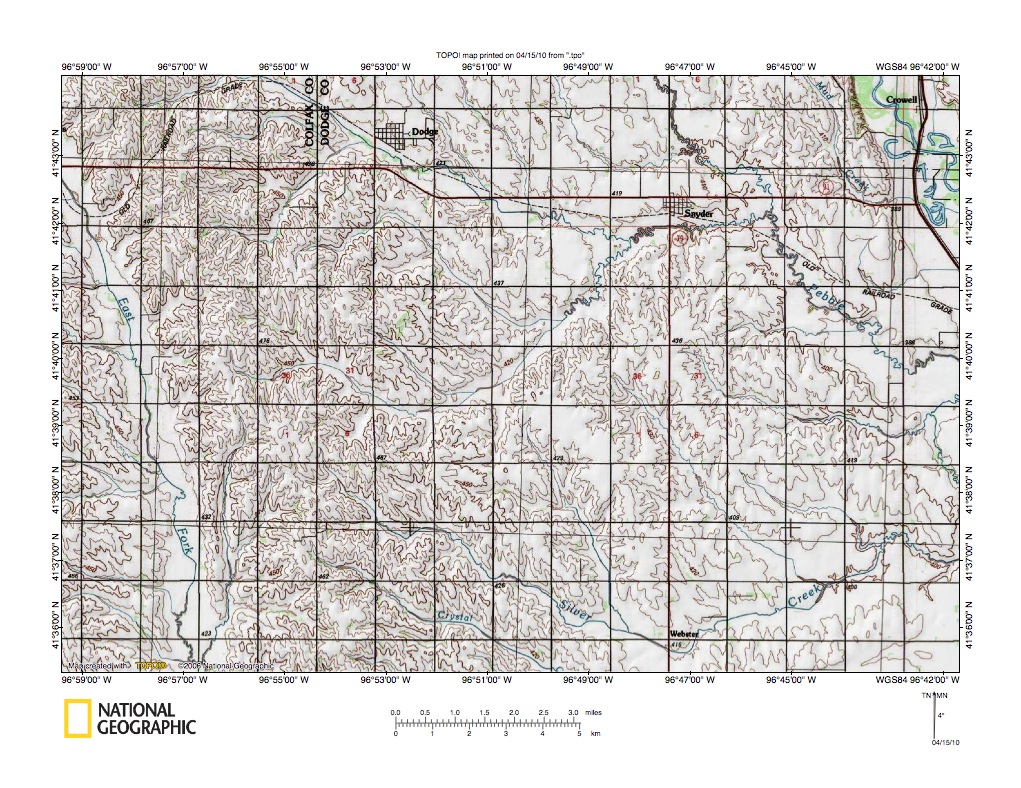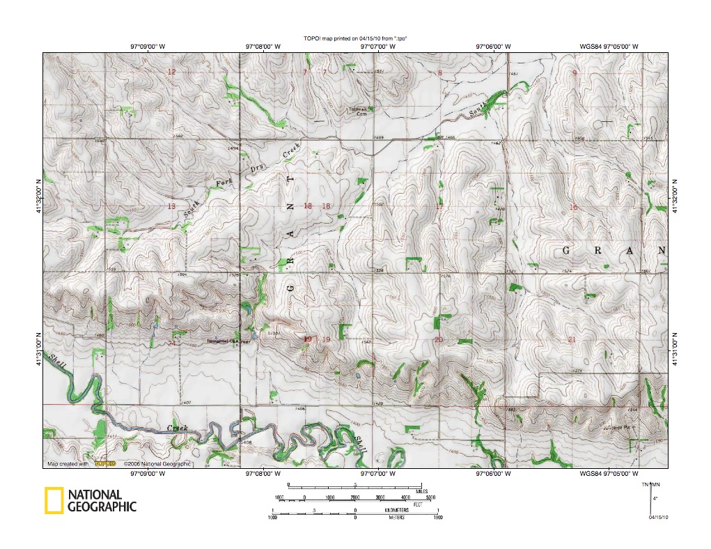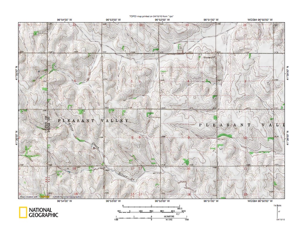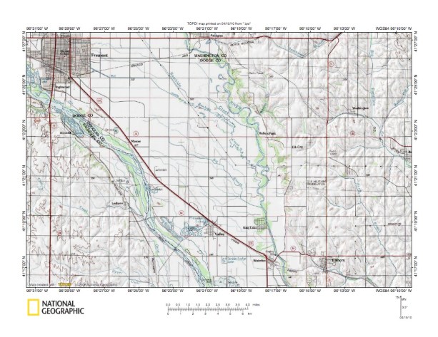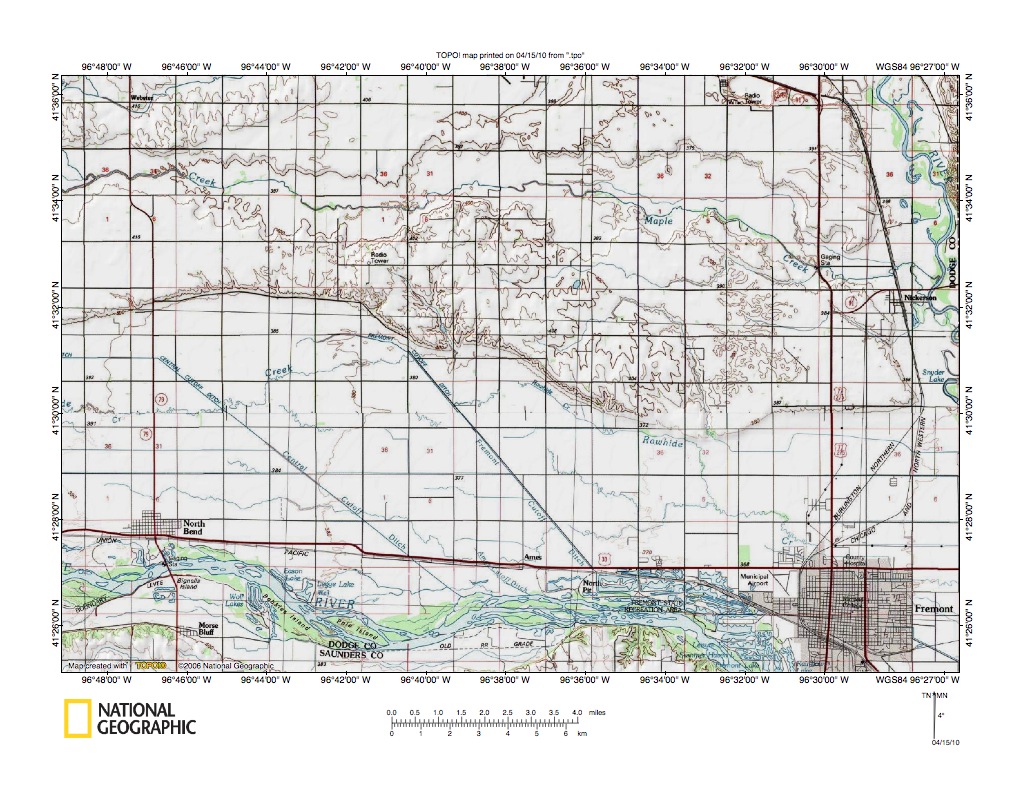 Figure 4: Maple Creek-Platte River drainage divide area northwest of Fremont. United States Geological Survey map digitally presented using National Geographic Society TOPO software.