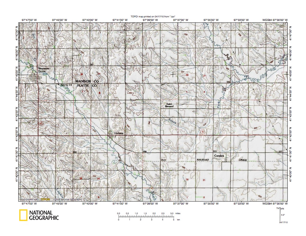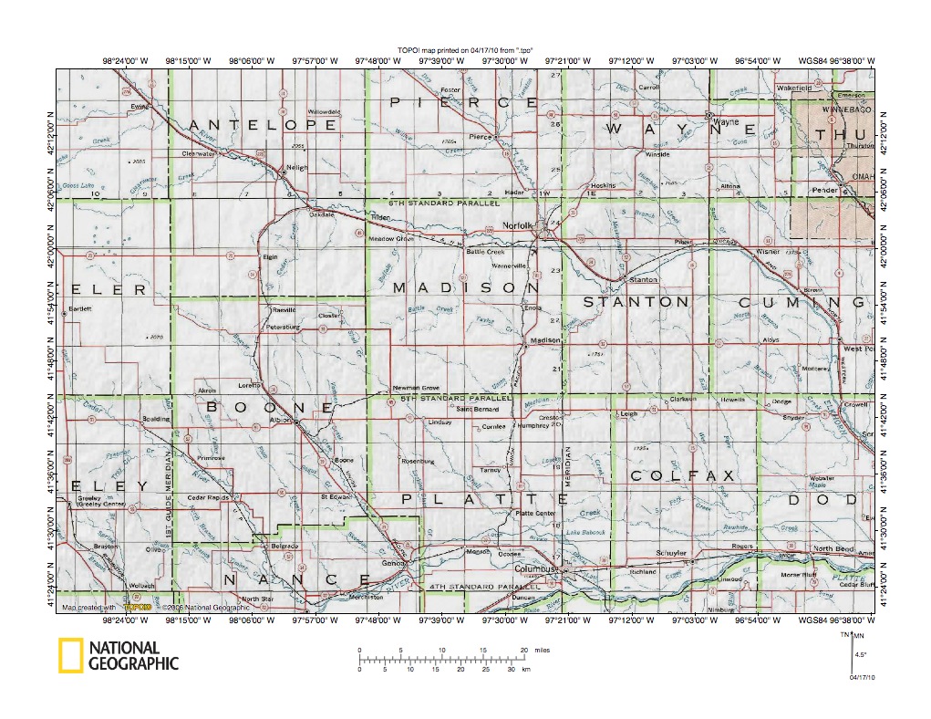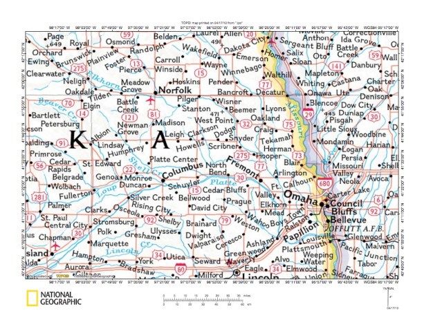 Figure 1: Elkhorn River-Shell Creek drainage divide area location map (select and click on maps to enlarge). National Geographic Society map digitally presented using National Geographic Society TOPO software.