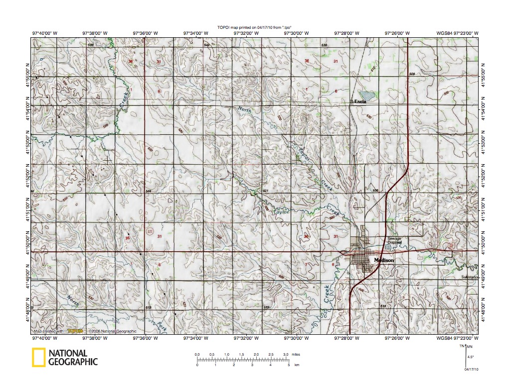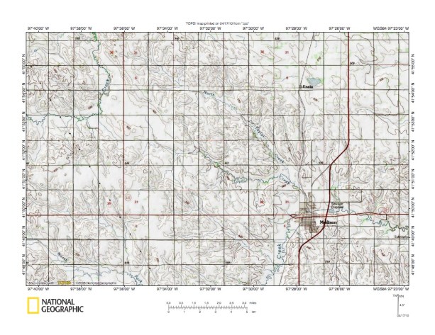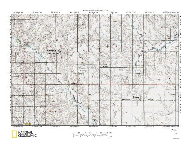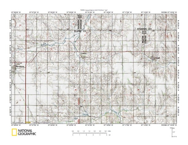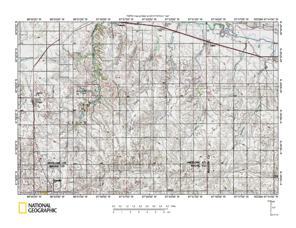 Figure 2: Elkhorn River-Shell Creek drainage divide area detailed location map. United States Geological Survey map digitally presented using National Geographic Society TOPO software.