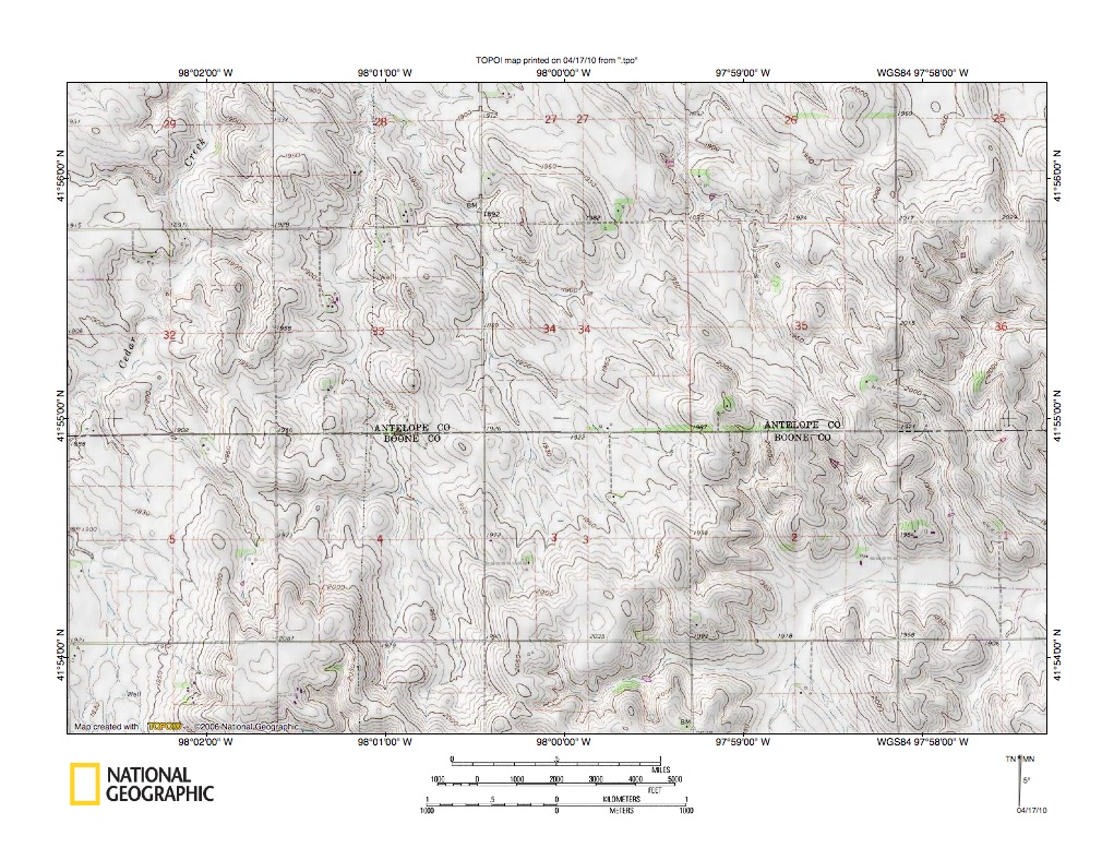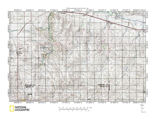 Figure 4: Detailed map of Cedar Creek-North Fork Shell Creek drainage divide area. United States Geological Survey map digitally presented using National Geographic Society TOPO software.