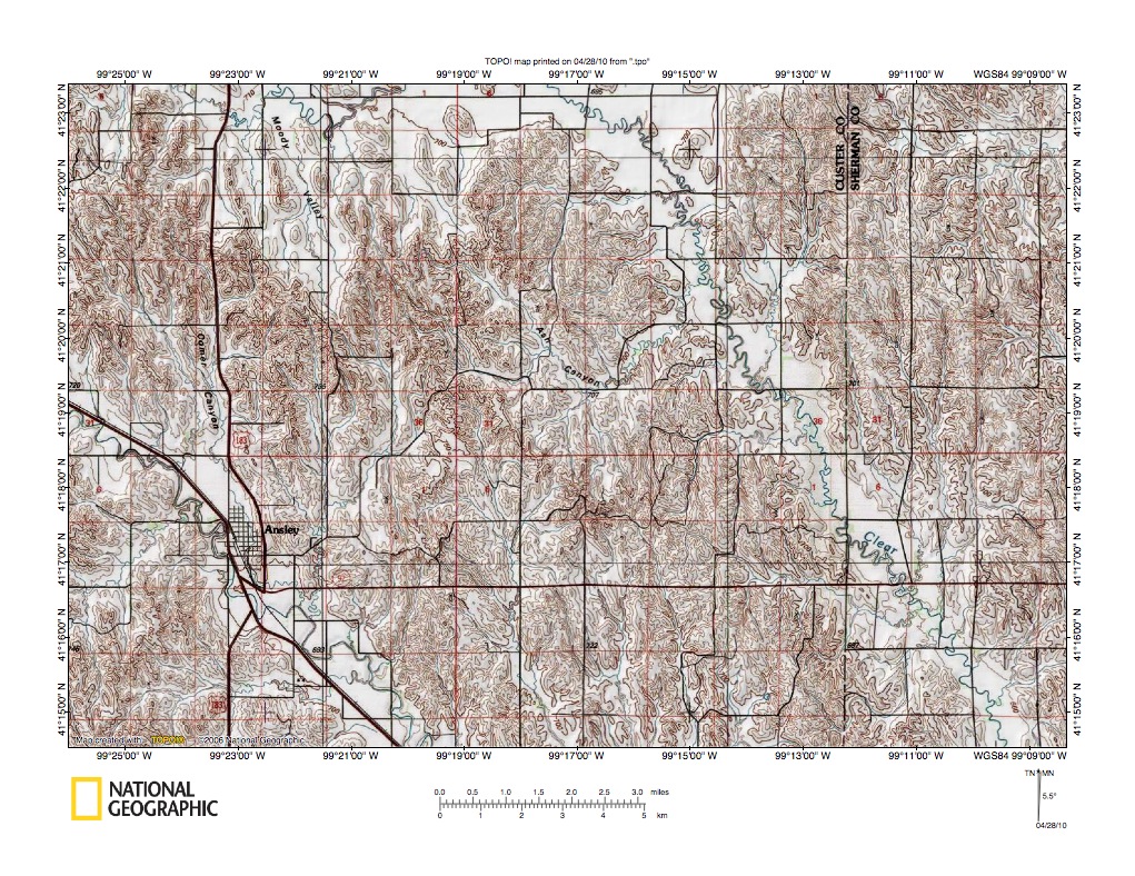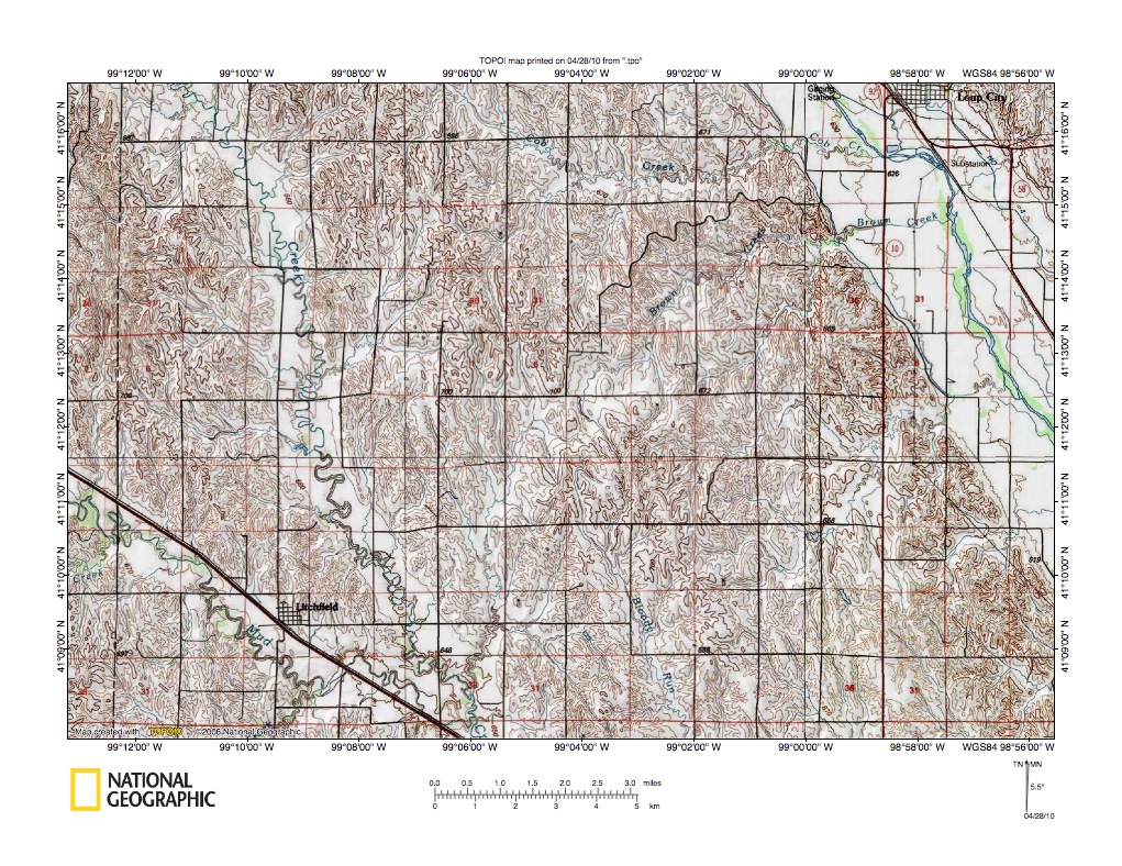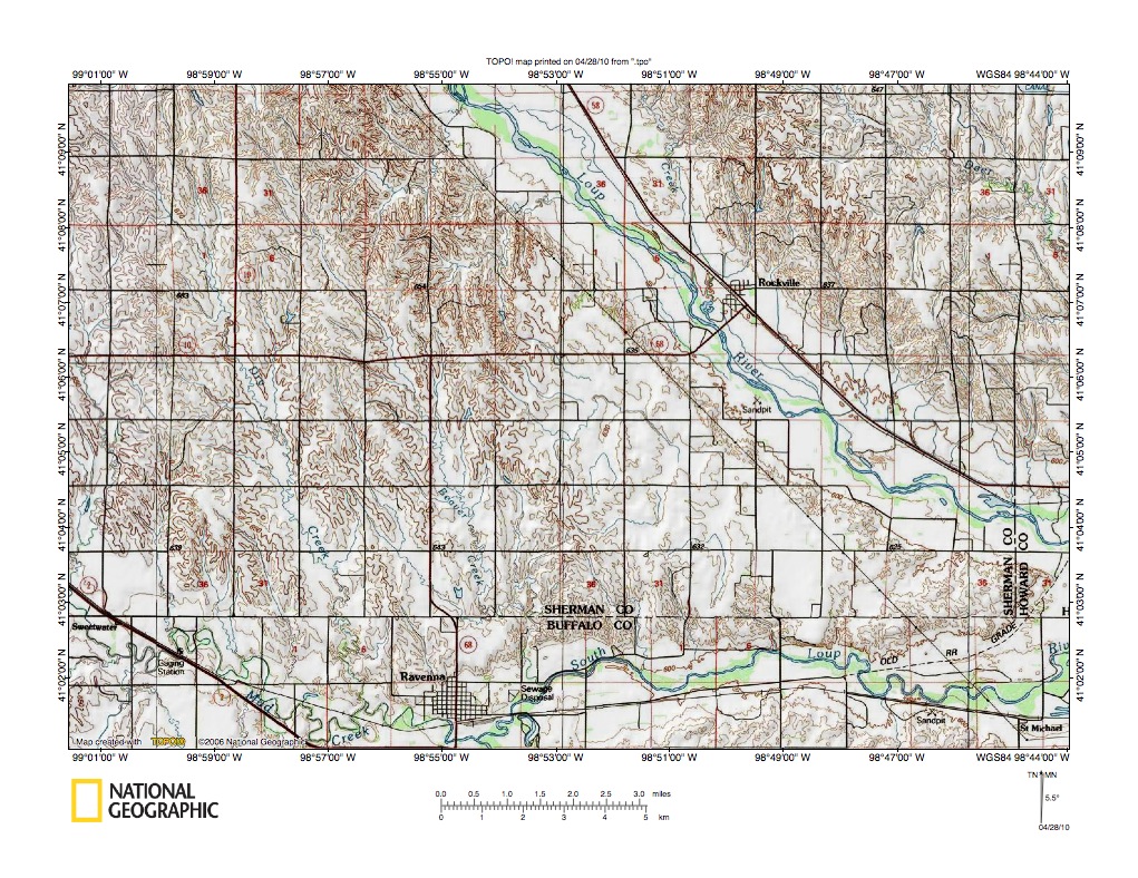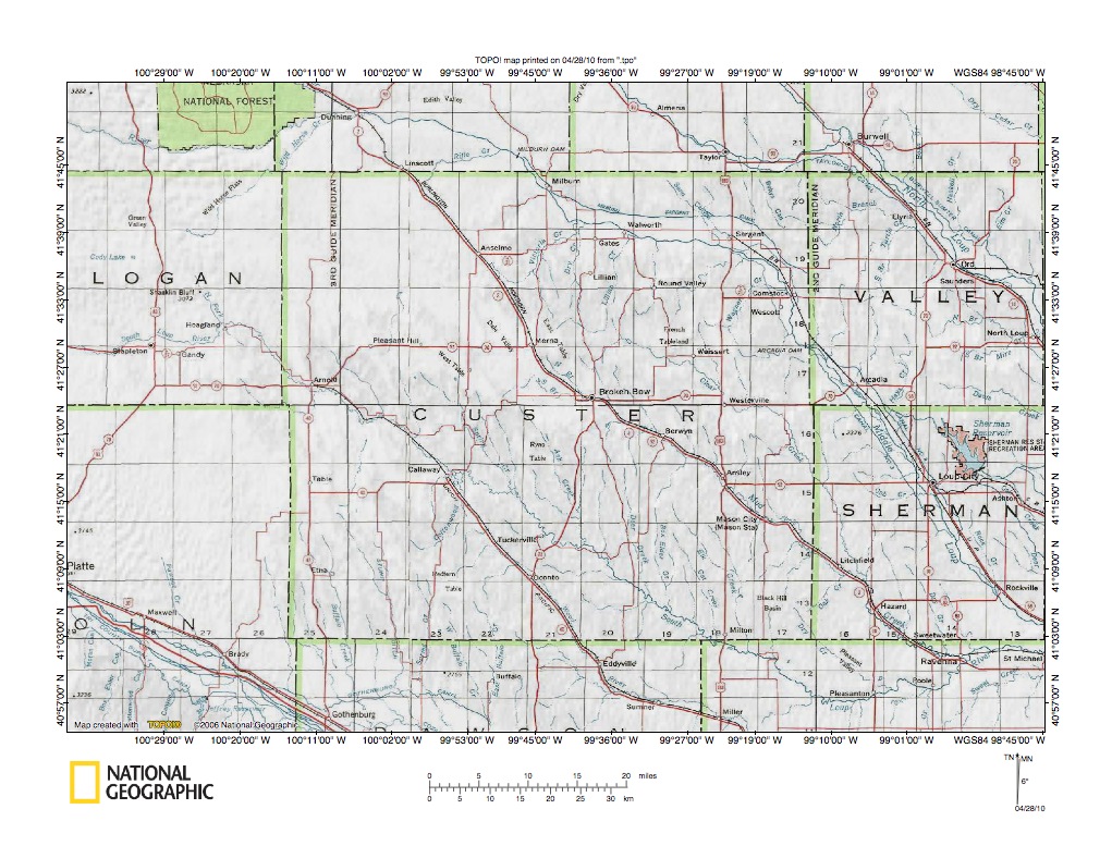 Figure 1: Middle Loup River-Mud Creek drainage divide area location map (select and click on maps to enlarge). National Geographic Society map digitally presented using National Geographic Society TOPO software.
