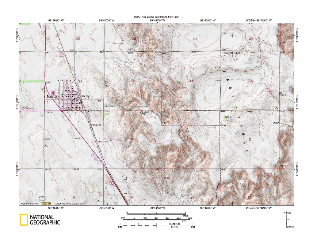 Figure 3a: Mud Creek headwaters located east of Merna and along west edge of East Table. United States Geological Survey map digitally presented using National Geographic Society TOPO software.