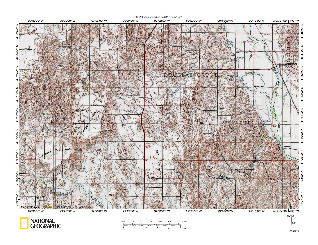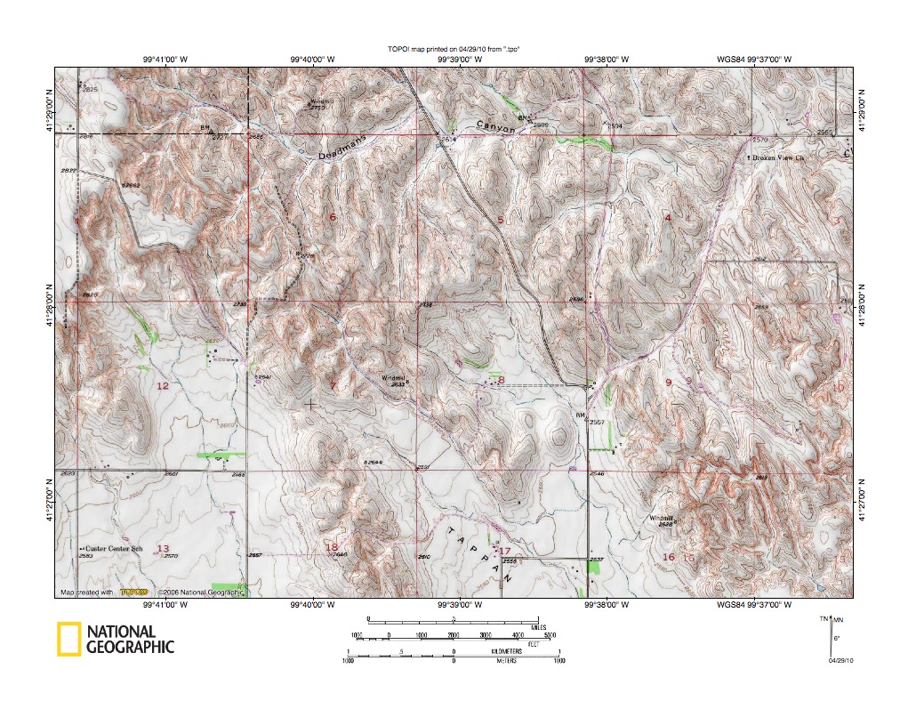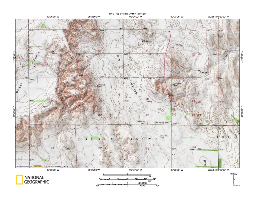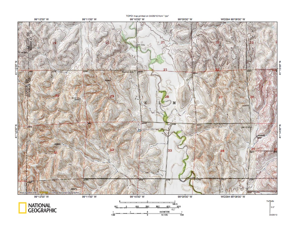 Figure 10: South end of Middle Loup River-Mud Creek drainage divide area. United States Geological Survey map digitally presented using National Geographic Society TOPO software.