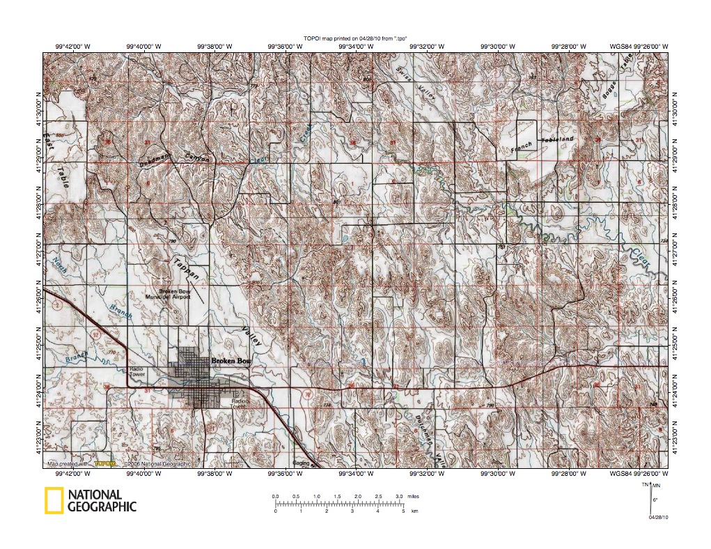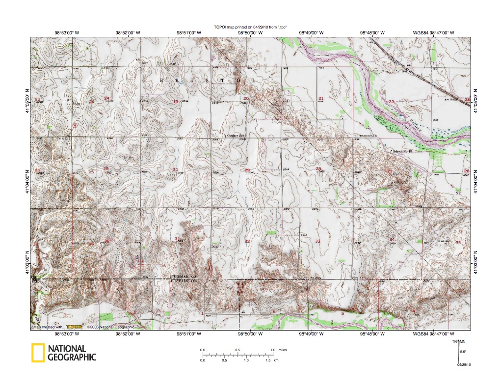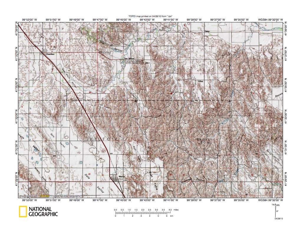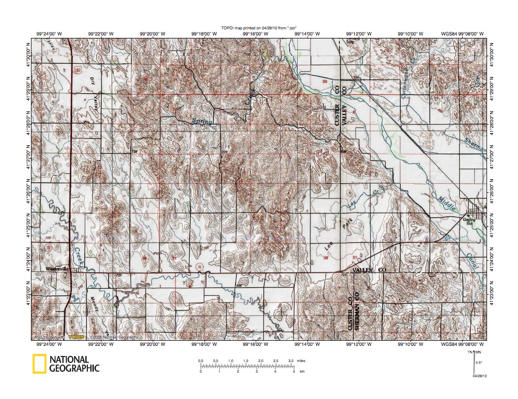 Figure 10a: Detailed map of Middle Loup River-South Loup River drainage divide area. United States Geological Survey map digitally presented using National Geographic Society TOPO software.