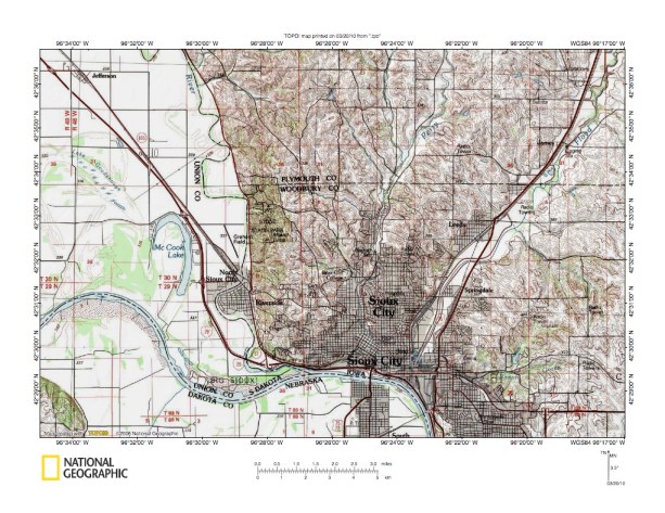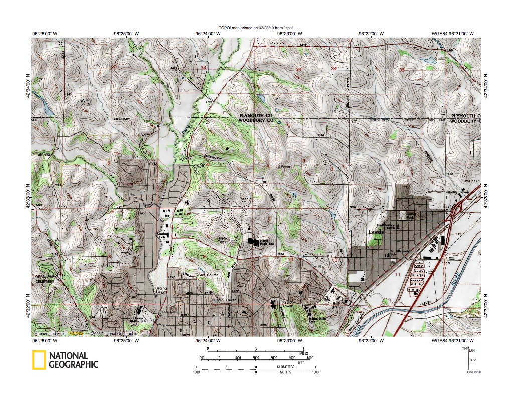 Figure 10a: Detailed map of Perry Creek-Floyd River drainage divide north of Sioux City, Iowa. United States Geological Survey map digitally presented using National Geographic Society TOPO software.