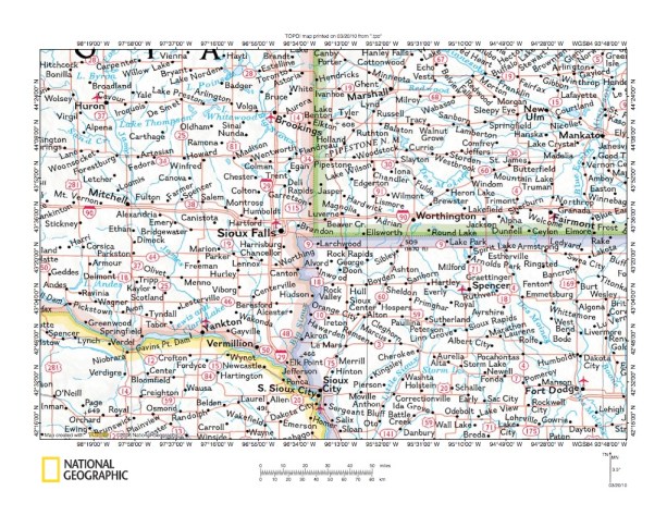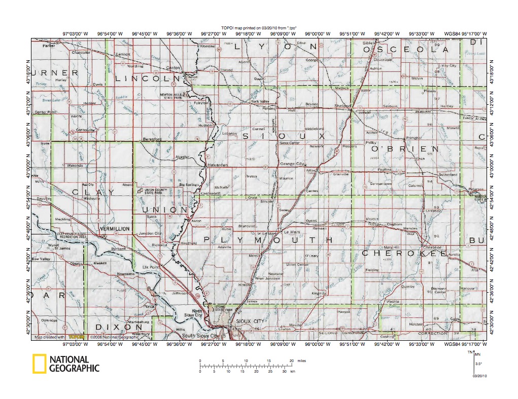 Figure 1: Big Sioux River-Floyd River drainage divide area location map (select and click on maps to enlarge). National Geographic Society map digitally presented using National Geographic Society TOPO software.