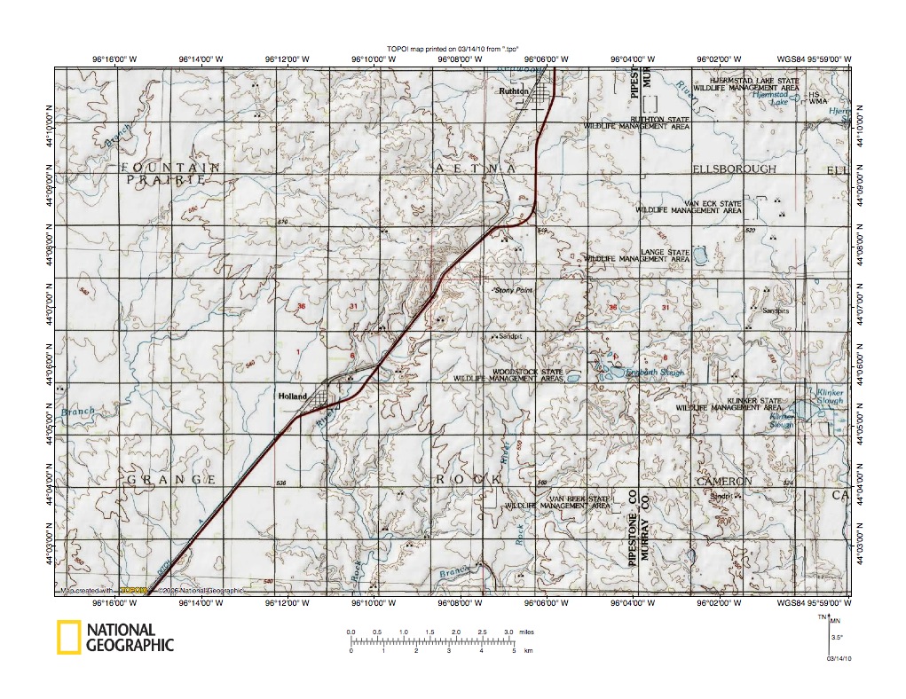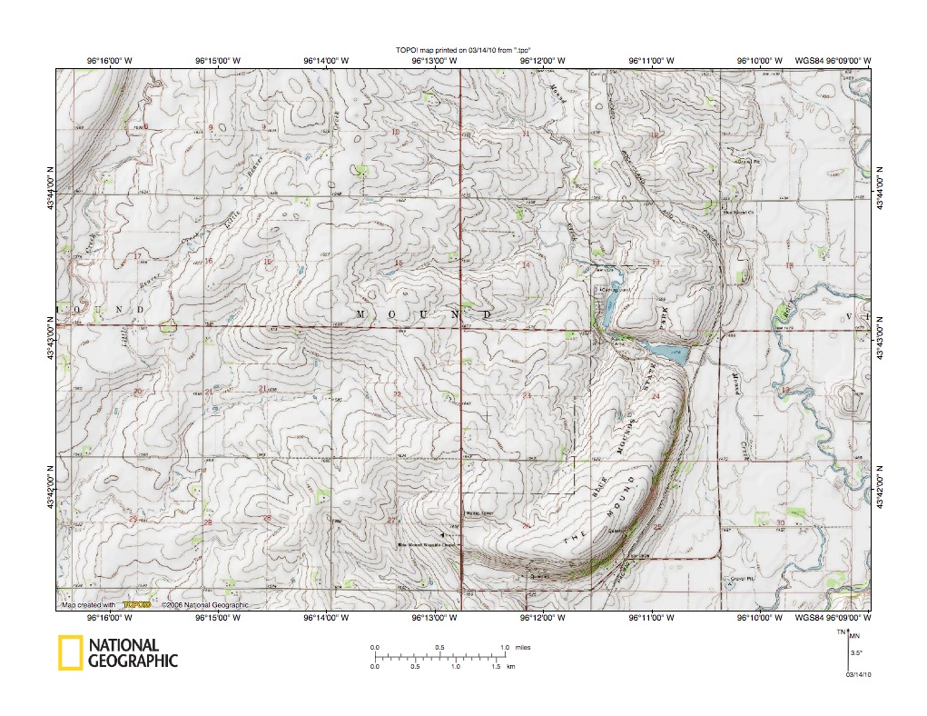 Figure 8: Detailed map of Beaver Creek-Rock River drainage divide near Blue Mound State Park, Minnesota. United States Geological Survey map digitally presented using National Geographic Society TOPO software.