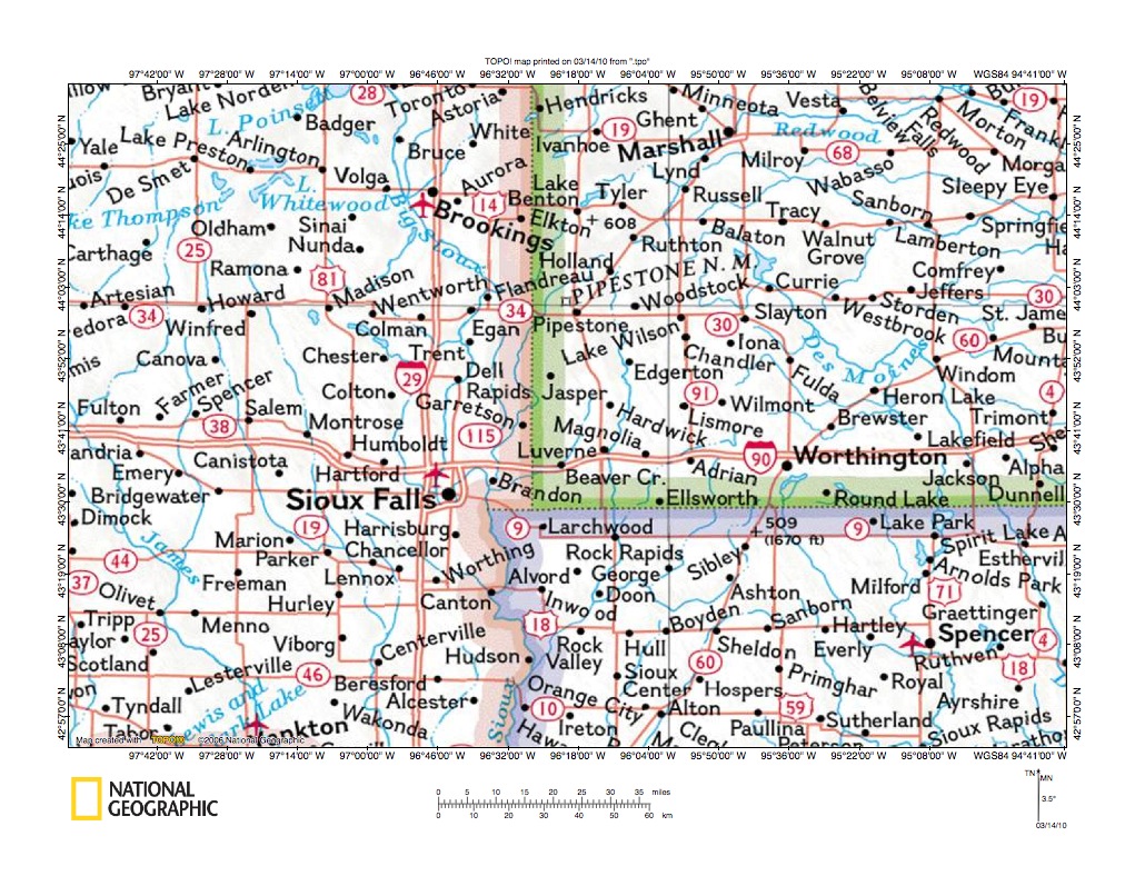 Figure 9: Split Rock Creek-Rock River drainage divide area near Pipestone, Minnesota. United States Geological Survey map digitally presented using National Geographic Society TOPO software.