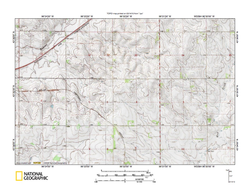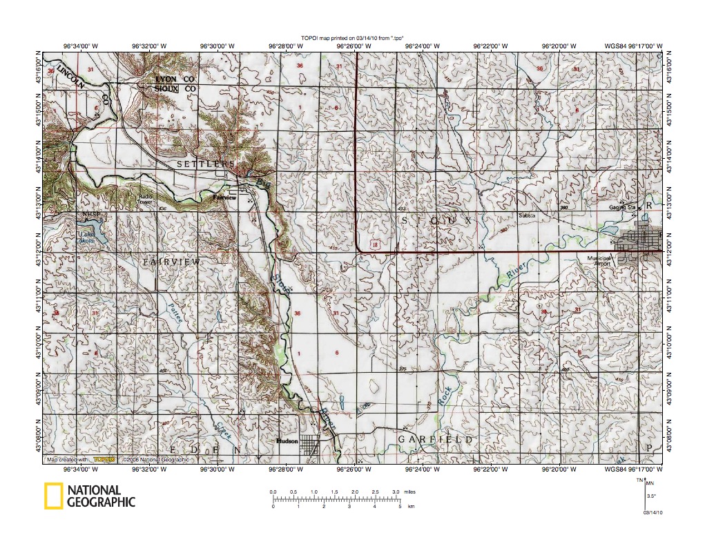 Figure 3: Big Sioux River-Rock River drainage divide area north of Hudson, South Dakota. United States Geological Survey map digitally presented using National Geographic Society TOPO software.