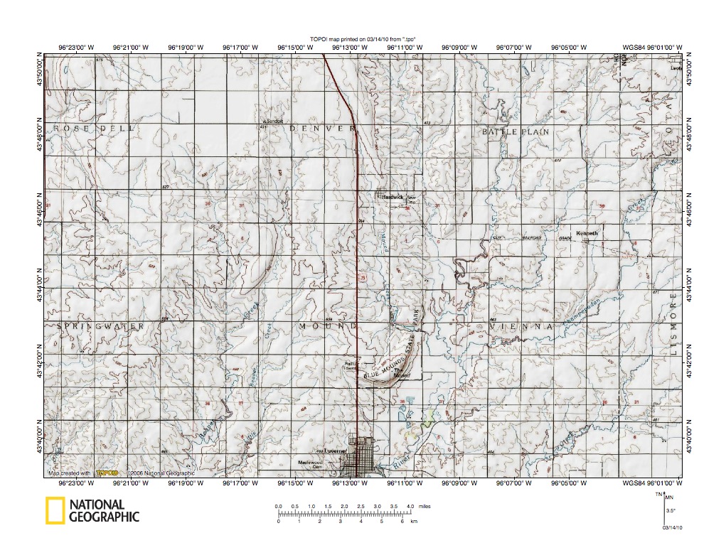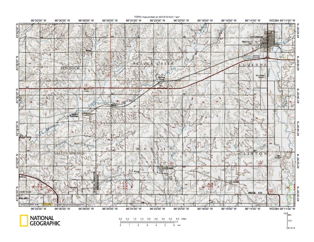 Figure 5: Beaver Creek-Mud Creek drainage divide southwest of Luverne, Minnesota. United States Geological Survey map digitally presented using National Geographic Society TOPO software.