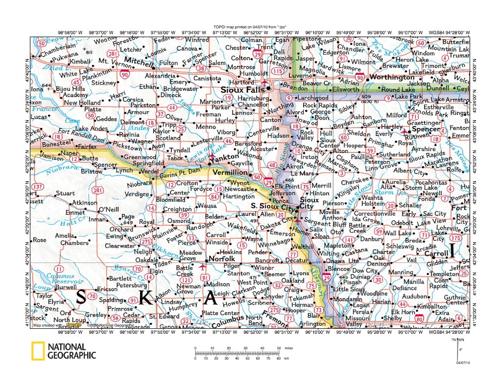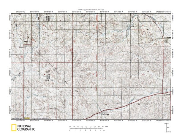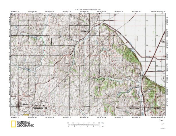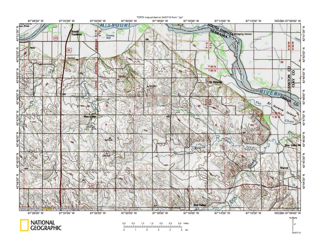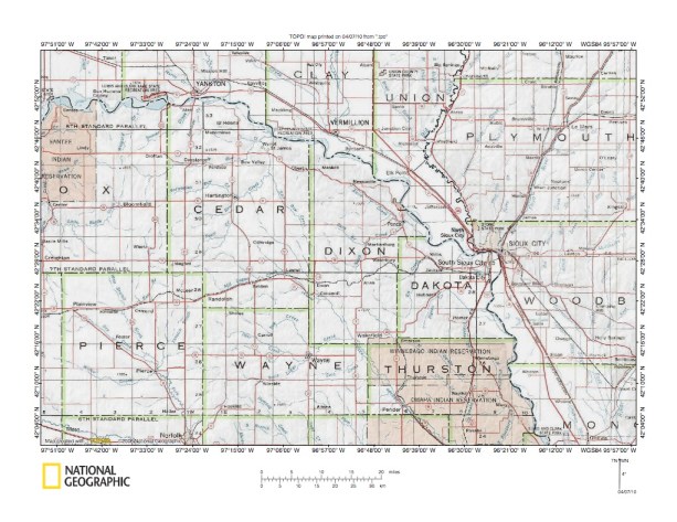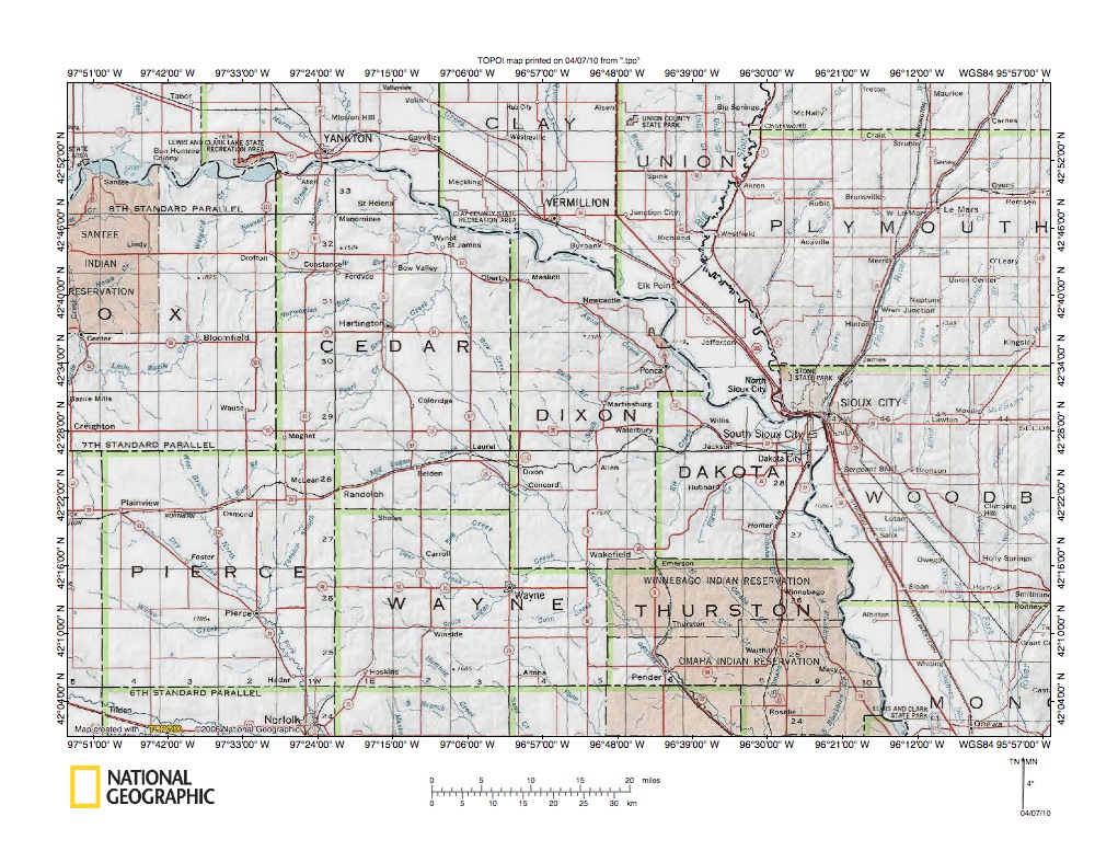 Figure 1: Cedar, Dixon, and Dakota County area, Nebraska location map (select and click on maps to enlarge). National Geographic Society map digitally presented using National Geographic Society TOPO software.