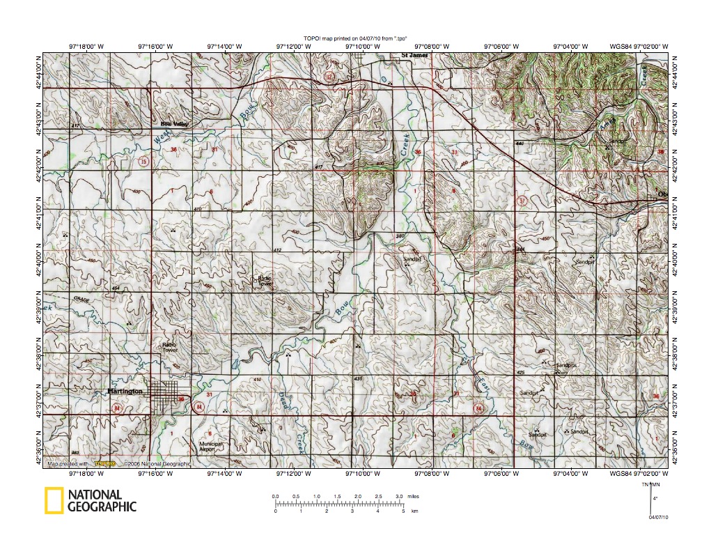 Figure 6: North Elkhorn River-Middle Logan Creek drainage divide. United States Geological Survey map digitally presented using National Geographic Society TOPO software.