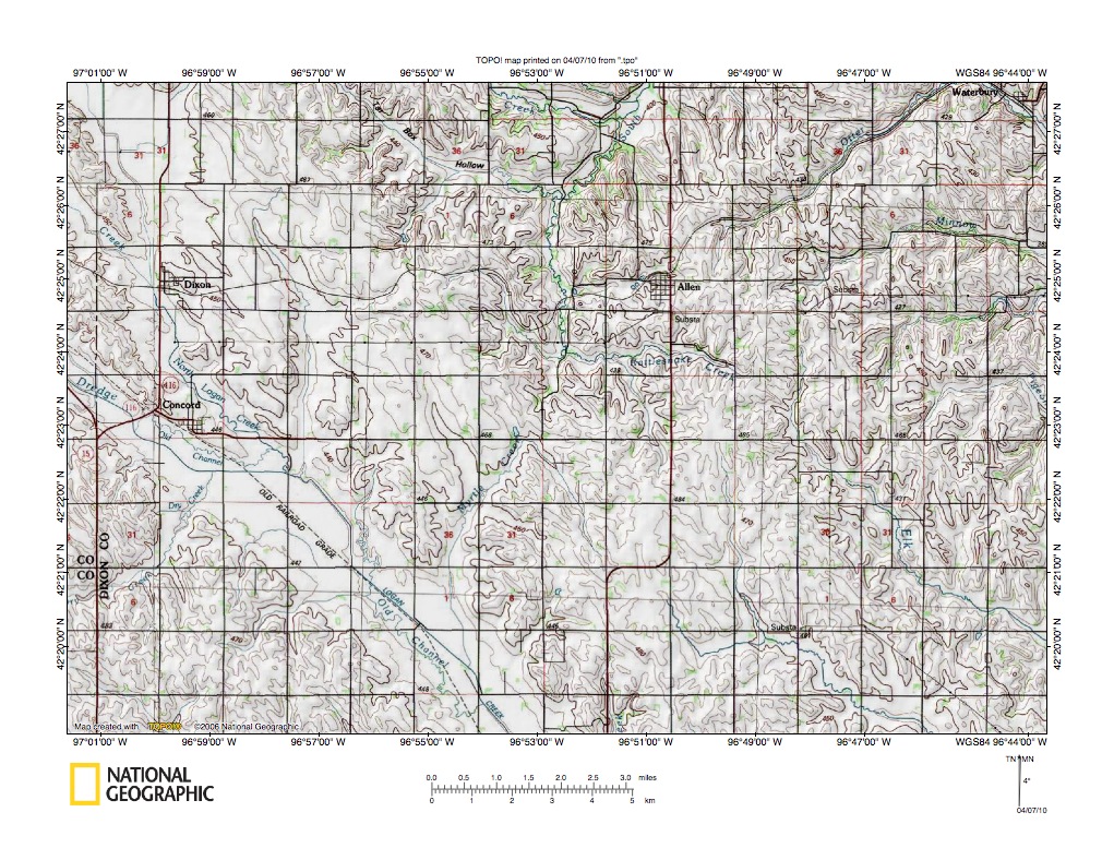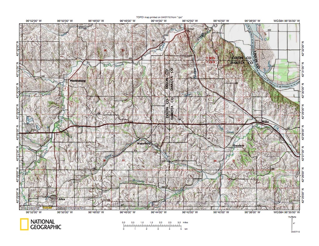 Figure 2: Cedar, Dixon, and Dakota County area, Nebraska detailed location map. United States Geological Survey map digitally presented using National Geographic Society TOPO software.