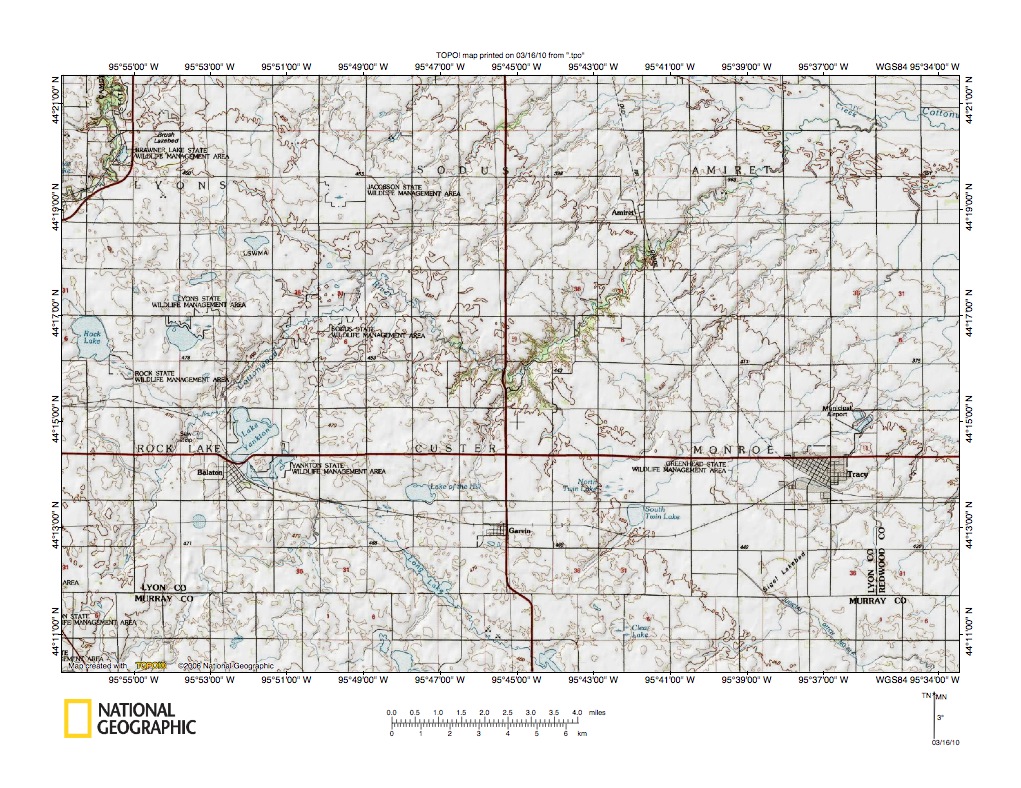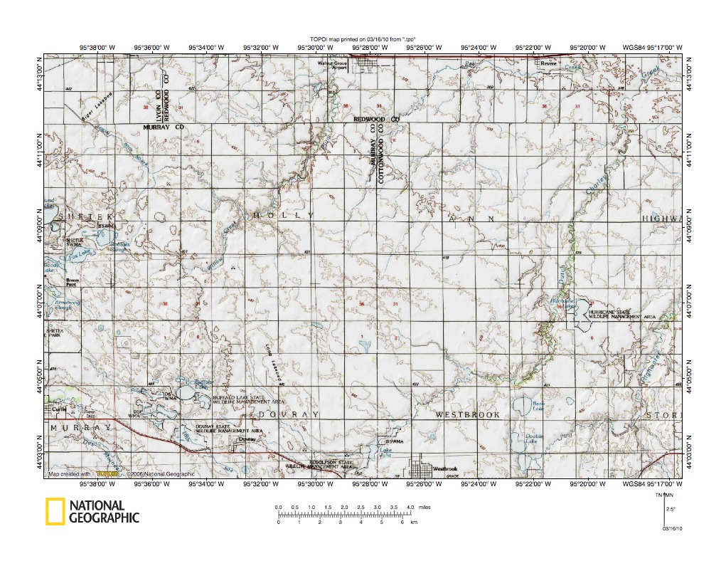 - Figure 2 provides a slightly more detailed map of the Rock-River-Des Moines River drainage divide area. Lincoln, Lyon, Redwood, Brown, Pipestone, Murray, Cottonwood, Rock, Nobles, and Jackson are Minnesota county names. The west to east oriented Minnesota-Iowa state line is located at the southern boundaries of Rock, Nobles, and Jackson Counties. The north-south South Dakota-Minnesota state line is located west of Lincoln, Pipestone, and Rock Counties. The Rock River originates near Holland in northeast Pipestone County and flows south in eastern Pipestone and Rock Counties. The Des Moines River originates in south central Lyon County and flows in a southeast direction to the Murray County southeast corner before making a jog to the northeast in Cottonwood County. In Cottonwood County the Des Moines River again makes an abrupt turn to flow in a south-southeast direction to Windom and then through Jackson County. The southeast-oriented Minnesota River is located the figure 2 northeast corner. The Redwood River originates near Ruthton in the Pipestone County northeast corner and flows in a southeast direction into the Murray County northwest corner before turning to flow in a northeast direction to Marshall, Minnesota in Lyon County. From Marshall the Redwood River flows north of the figure 2 map area to eventually reach the southeast-oriented Minnesota River. Another river of importance is the Little Sioux River, which originates in southern Jackson County. The Little Sioux River flows south from Jackson County into Iowa and eventually turns to flow in southwest direction to reach the Missouri River. In other words the Rock River-Des Moines River drainage divide area is located almost entirely Murray County and northern Nobles County, with a small area in Pipestone County. To the north is the Big Sioux River-Minnesota River drainage divide area in Brookings County, South Dakota Lincoln, and Lyon Counties, Minnesota and to the south is the Rock River-Little Sioux River drainage divide area (essays describing these drainage divide areas can be found under Big Sioux River on the sidebar category list). This essay begins with the Redwood River-Rock River-Beaver Creek drainage divide area near the Lincoln, Lyon, Pipestone, and Murray County corner. Next the essay illustrates the Redwood River valley northeast of the drainage divide to show how the drainage divide is related to the northeast-facing Prairie Coteau escarpment. The essay then follows the escarpment in a southeast direction and concludes by showing the escarpment’s relationship to the Des Moines River headwaters area.