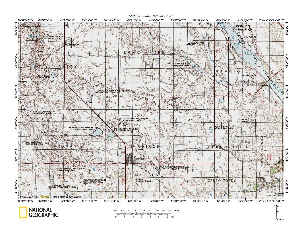 Figure 8: Minnesota River valley and tributaries northeast of Madison, Minnesota. United States Geological Survey map digitally presented using National Geographic Society TOPO software.