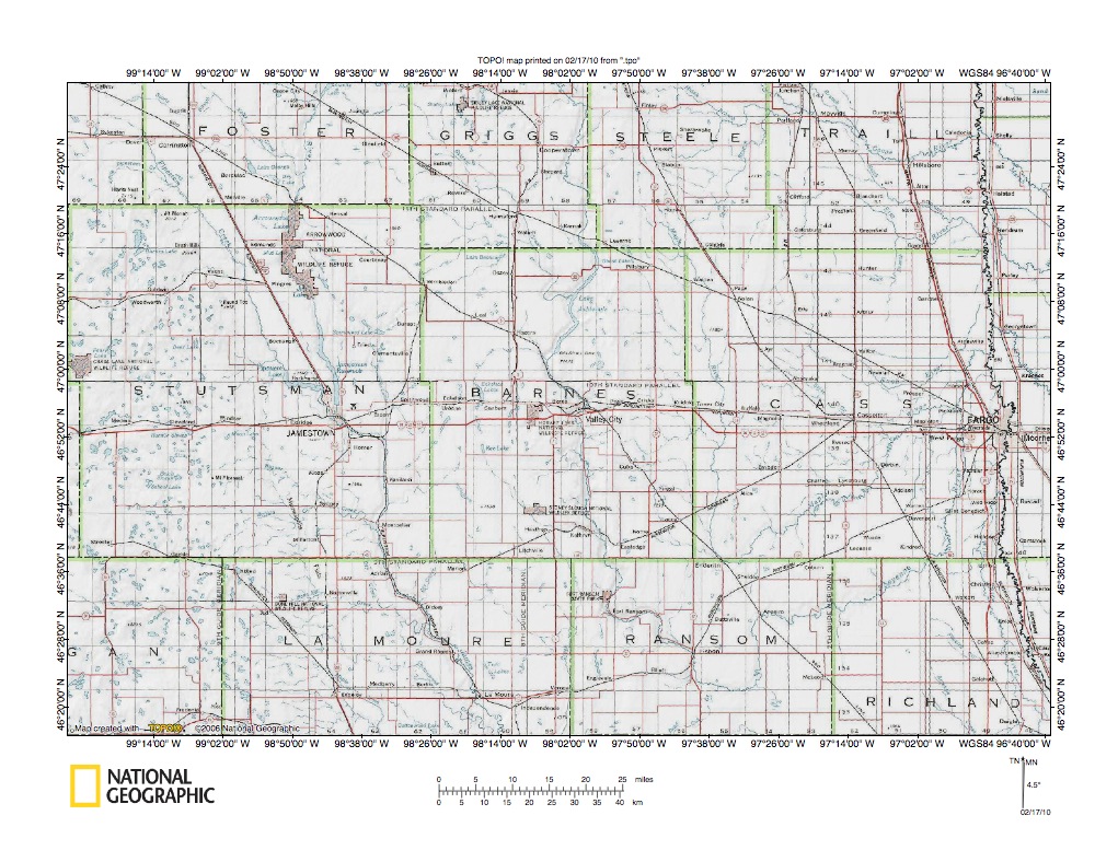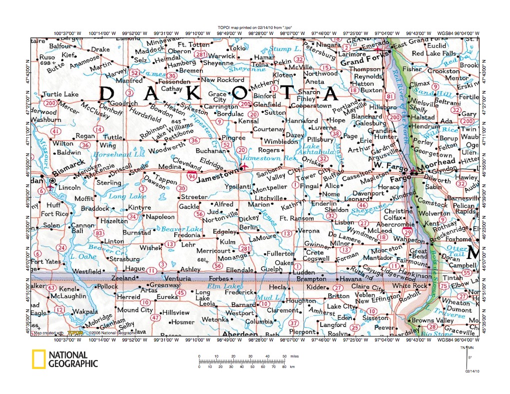Figure 1: James River-Sheyenne River drainage divide area location map (select and click on maps to enlarge). National Geographic Society map digitally presented using National Geographic Society TOPO software.