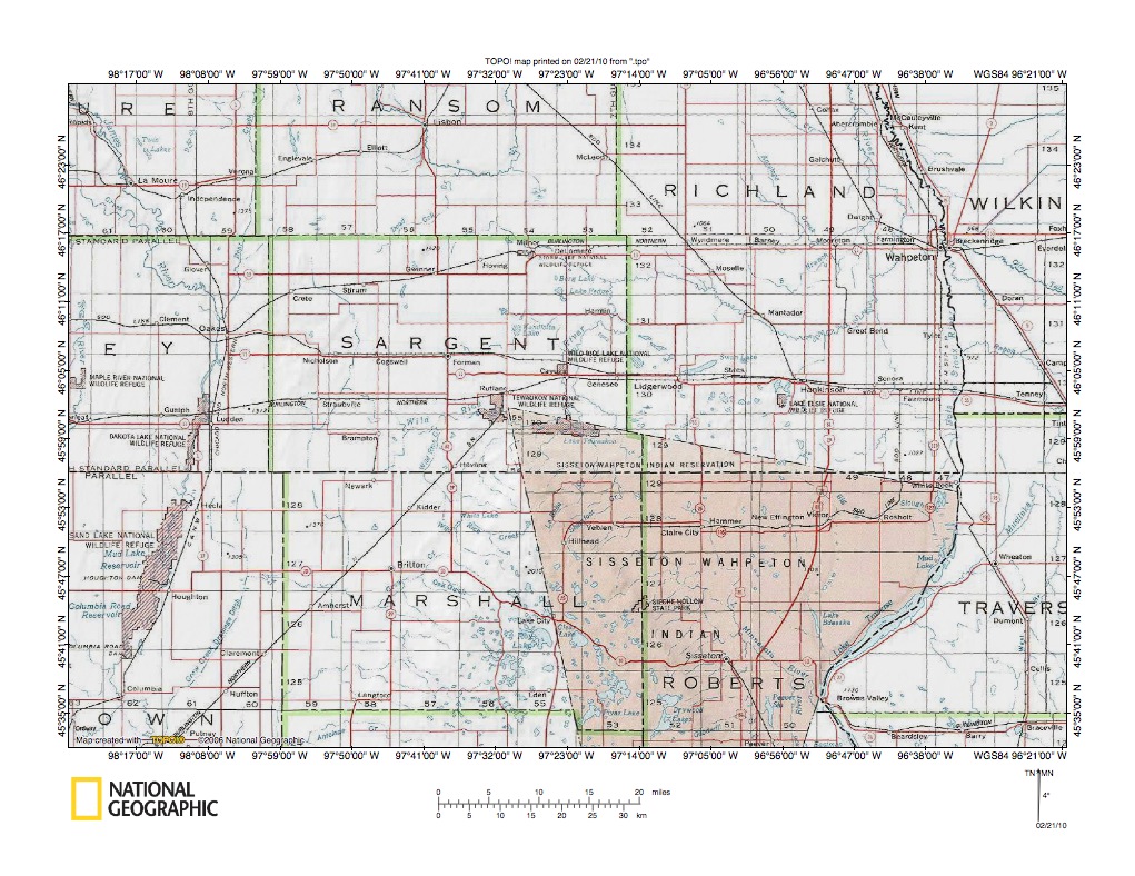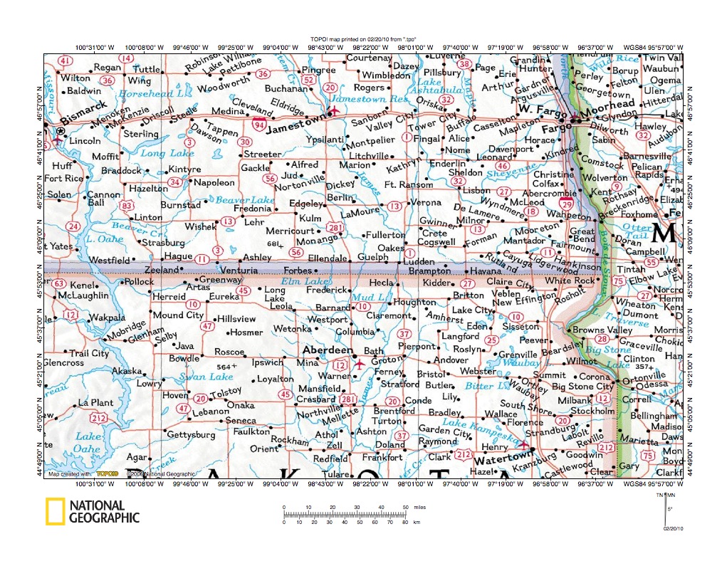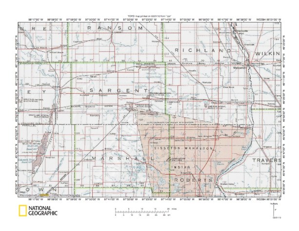 Figure 1: James River-Wild Rice River drainage divide area location map (select and click on maps to enlarge). National Geographic Society map digitally presented using National Geographic Society TOPO software.
