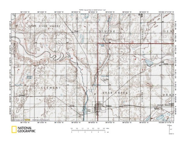Figure 4: James River-Bear Creek confluence north of Oakes. United States Geological Survey map digitally presented using National Geographic Society TOPO software.