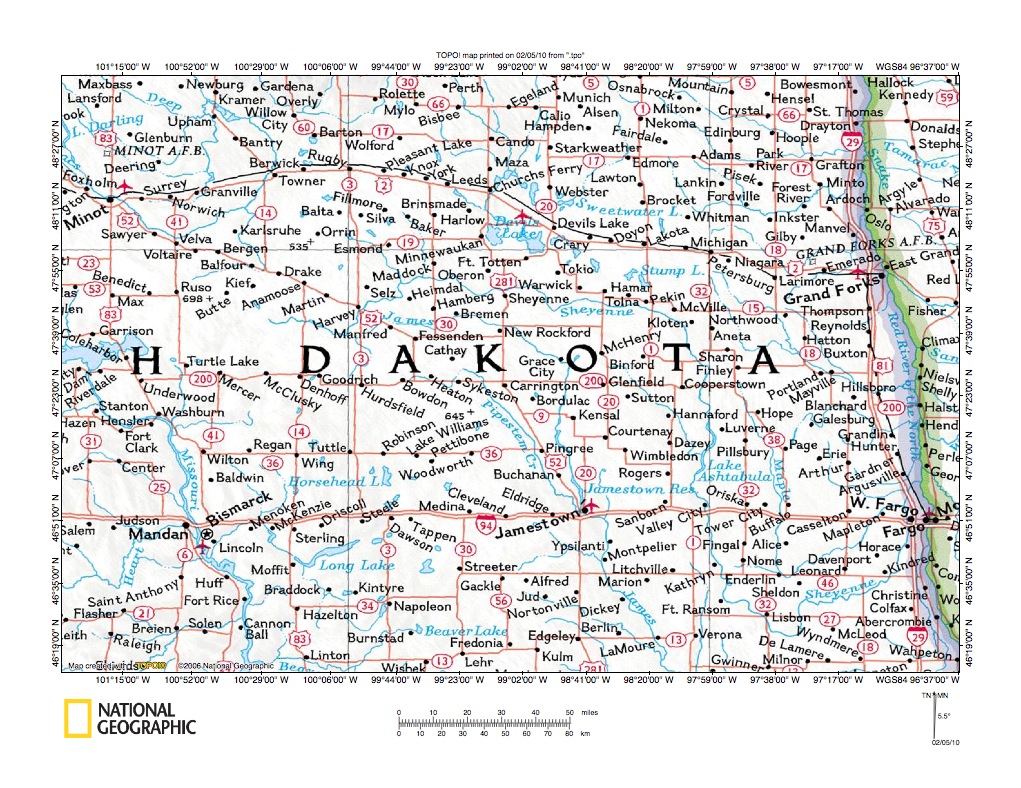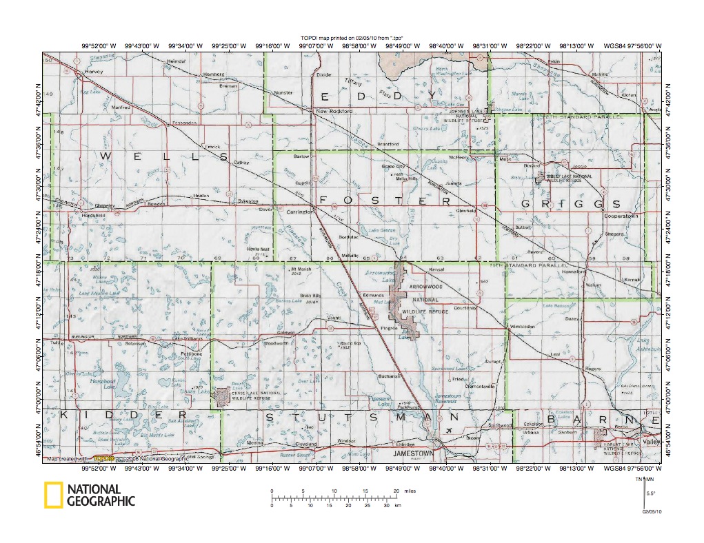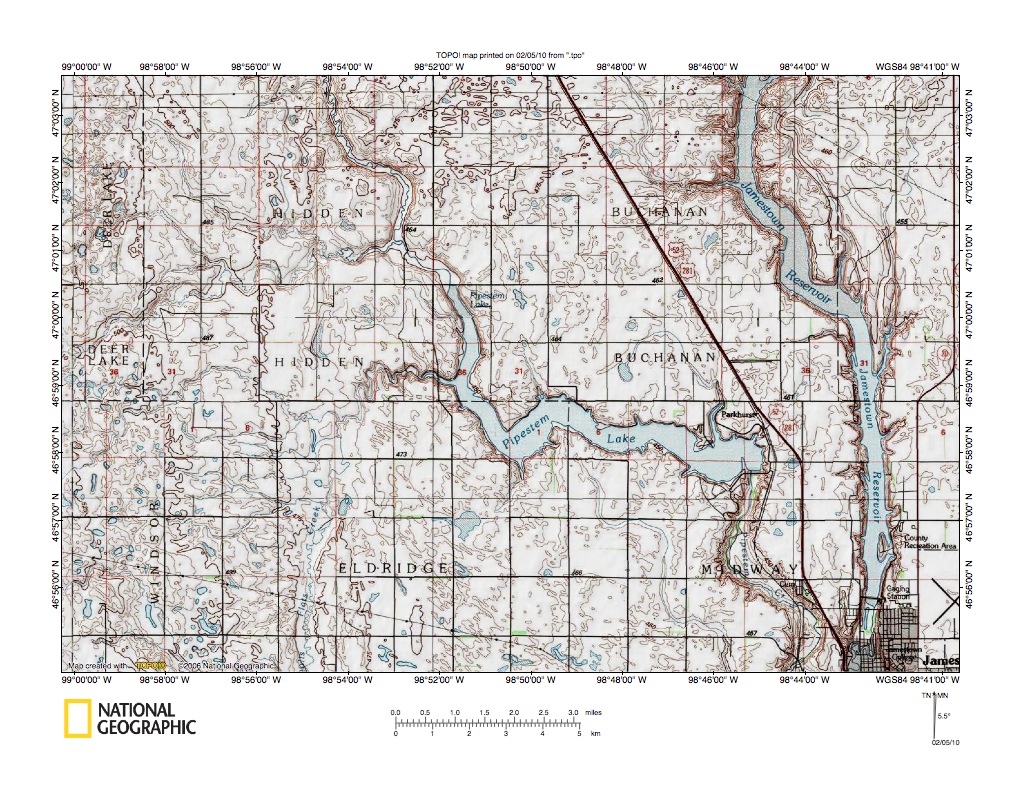 Figure 1: Pipestem Creek-James River drainage divide area location map (select and click on maps to enlarge). National Geographic Society map digitally presented using National Geographic Society TOPO software.