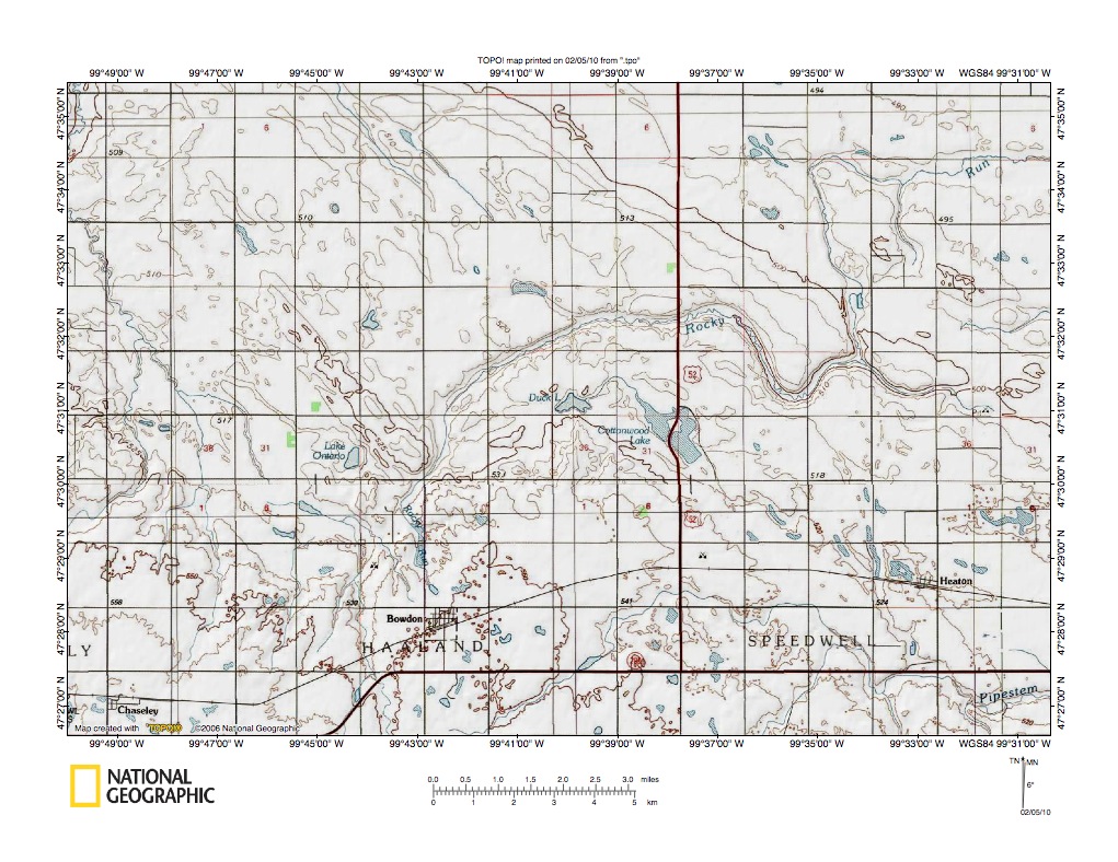 Figure 5: Rocky Run-Pipestem Creek drainage divide northwest of Carrington. United States Geological Survey map digitally presented using National Geographic Society TOPO software.
