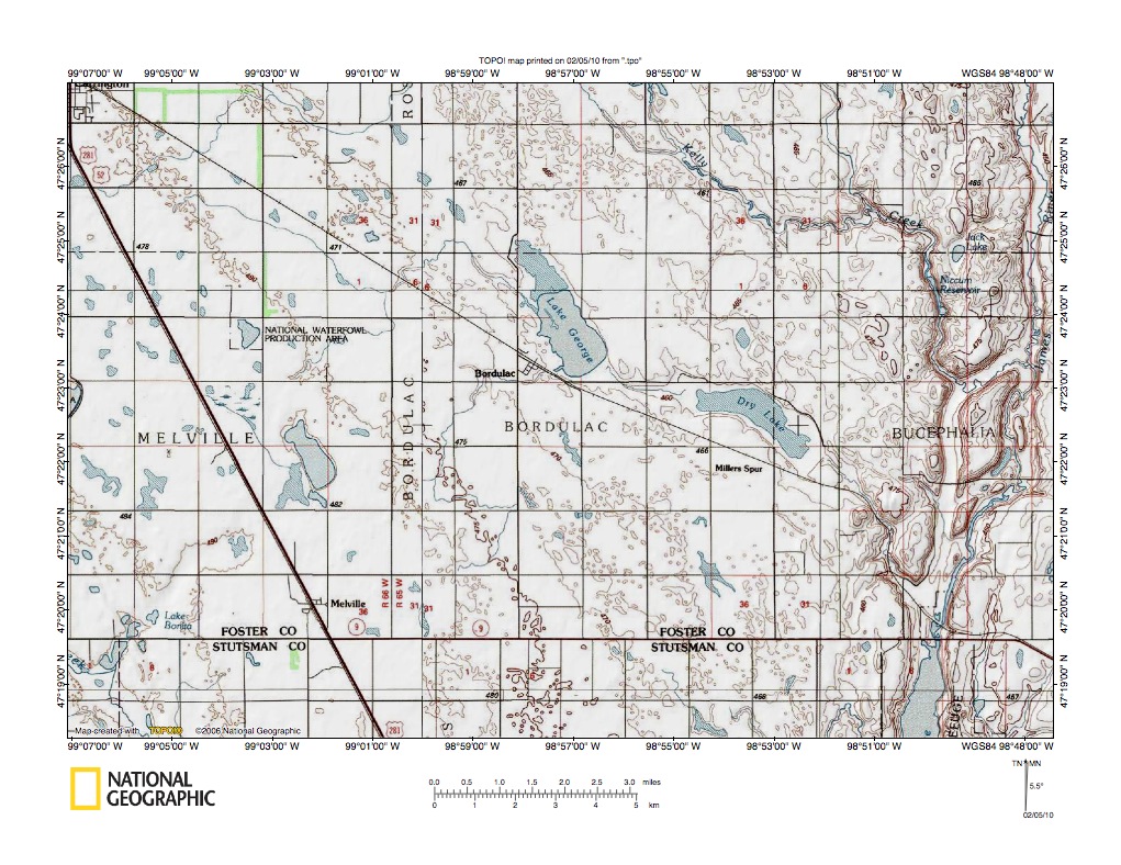 Figure 4: Sheyenne River-James River drainage divide area near Manfred, North Dakota. United States Geological Survey map digitally presented using National Geographic Society TOPO software.
