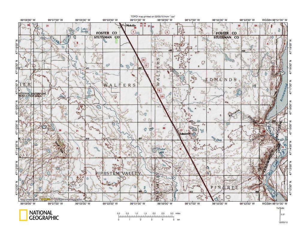 Figure 3: James River-Pipestem Creek drainage divide near Bowdon, North Dakota. United States Geological Survey map digitally presented using National Geographic Society TOPO software.
